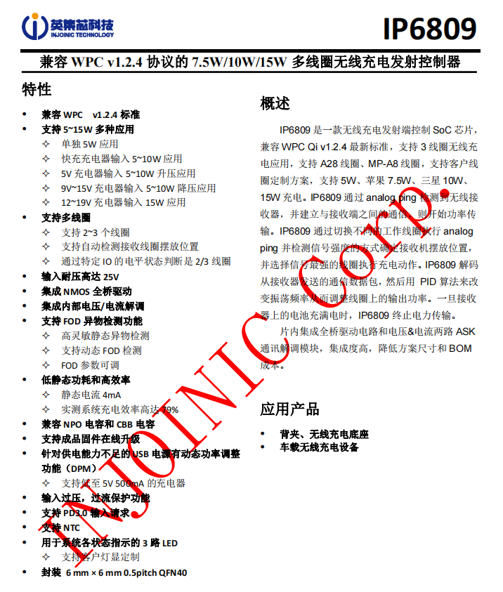 IP6809支持快充充電器輸入,5-15W輸出,支持2-3個(gè)線圈,內(nèi)部集成NMOS驅(qū)動(dòng)和電壓電流解調(diào),支持異物檢測(cè)功能,低靜態(tài)功耗,高效率,兼容NPO和CBB電容,并且支持多種保護(hù)功能,采用QFN40封裝。