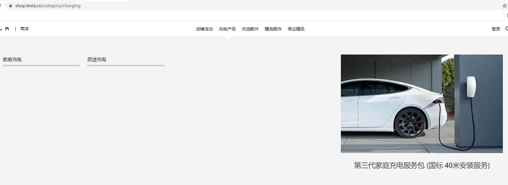 先來看一下目前新能源車的充電方式,這里以特斯拉為例,打開特斯拉的官網并選擇充電產品界面。目前特斯拉汽車的充電方式主要分為充電樁充電、家庭充電和旅途充電三種。