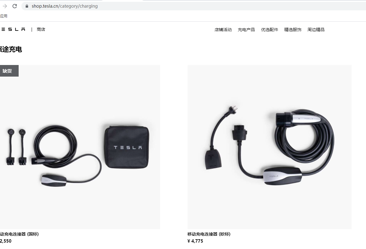 旅途充電方面特斯拉官網提供了兩種移動充電器,其中國標版本的顯示為缺貨狀態,但我們細看價格,國標的旅途充電器為2550元,歐標的價格為4775元。