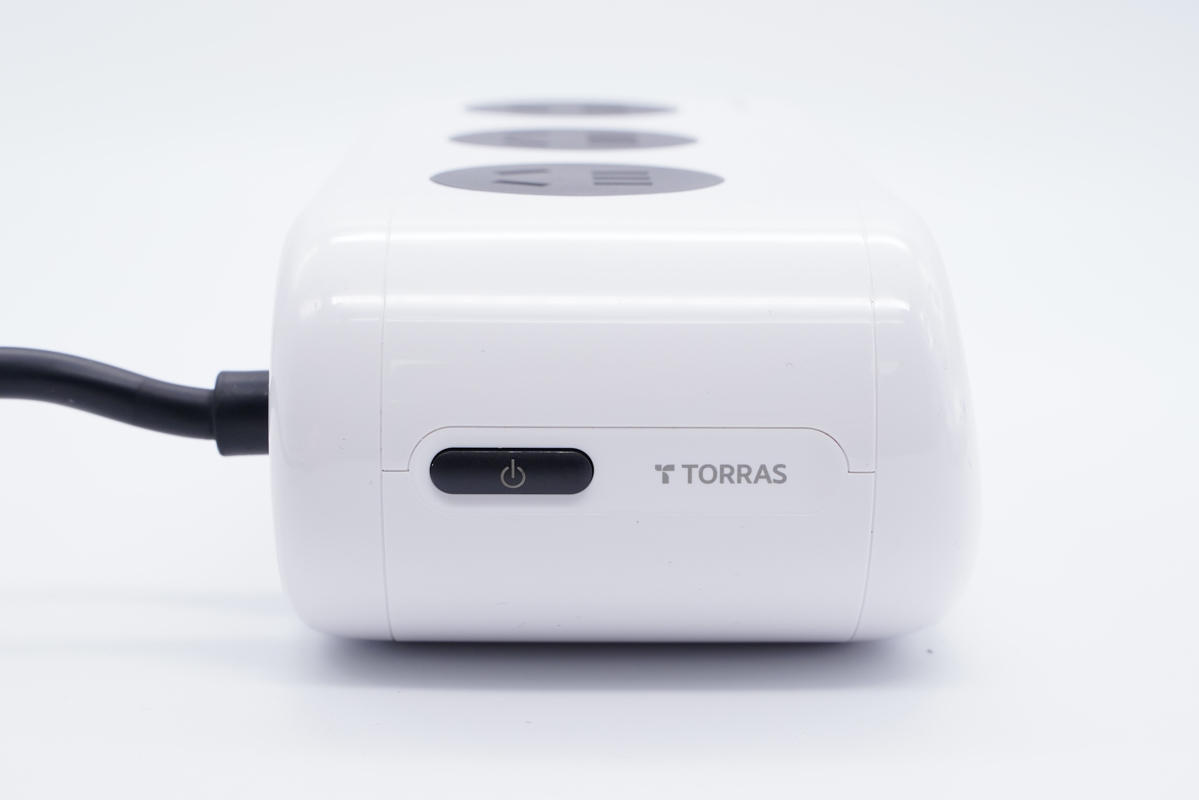 右側(cè)設(shè)有黑色電源鍵,旁邊是TORRAS品牌logo。