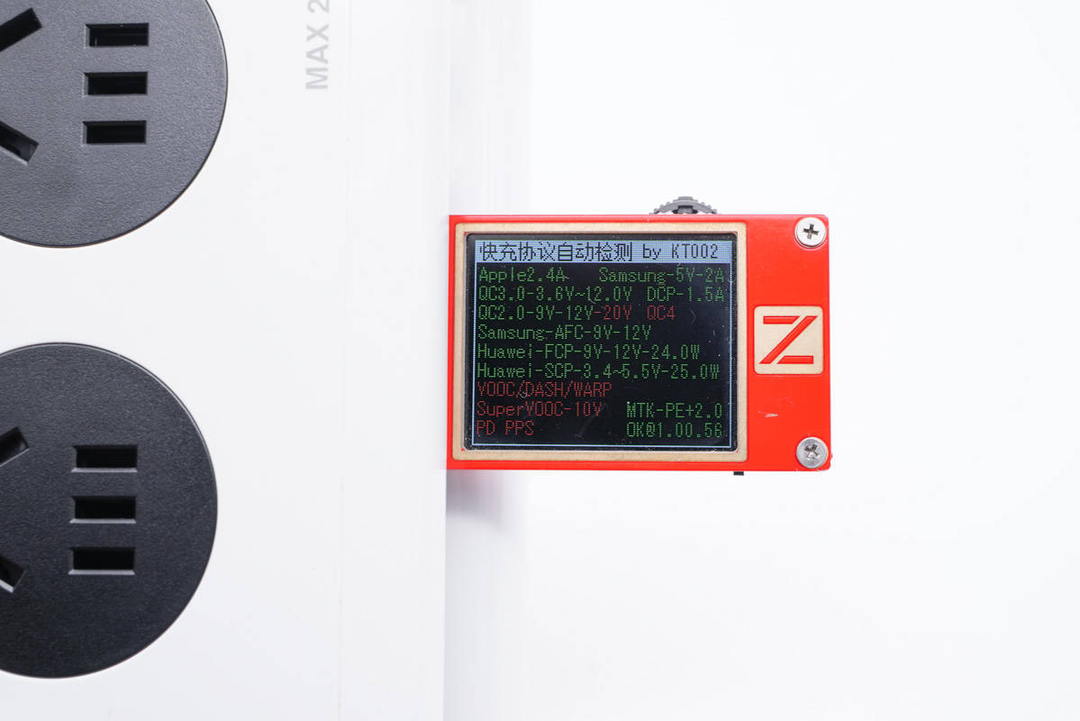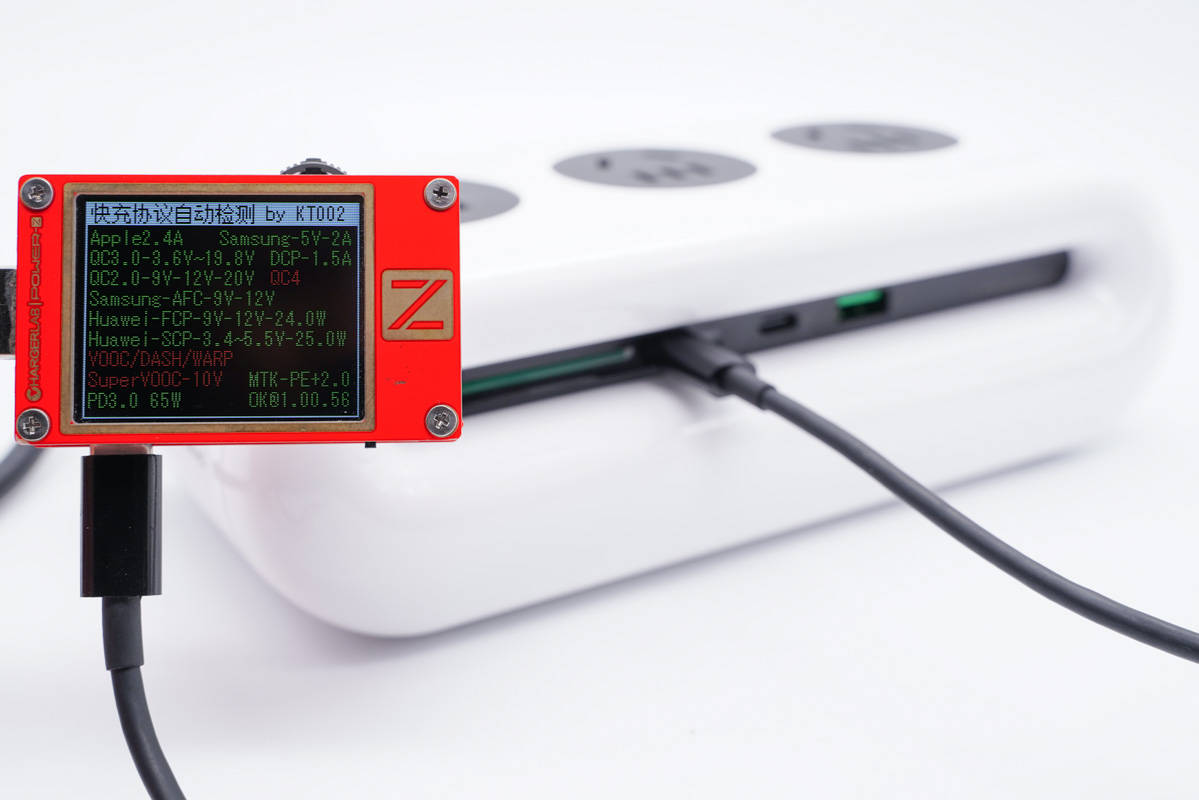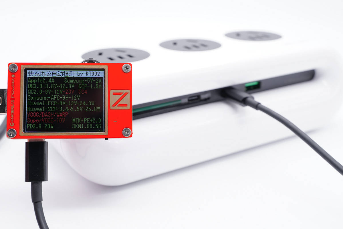 使用ChargerLAB POWER-Z KT002測得USB-C1口支持Apple 2.4A、Samsung 5V2A、DCP協(xié)議,以及QC2.0/3.0、AFC、FCP、SCP、PE2.0、PD3.0多個(gè)快充協(xié)議。