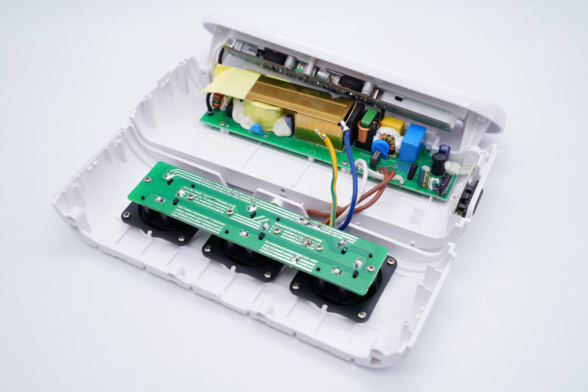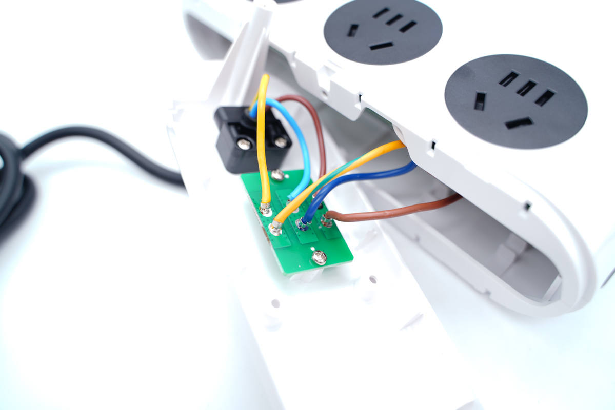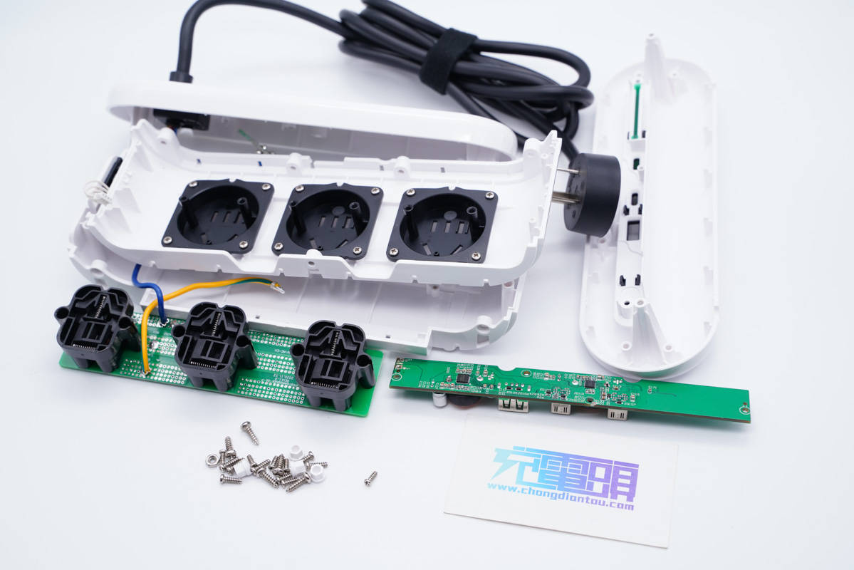 三個(gè)AC插口的金屬片焊接在小板上,板子使用螺絲固定在外殼內(nèi)部,黑色塑料殼也是使用螺絲固定。