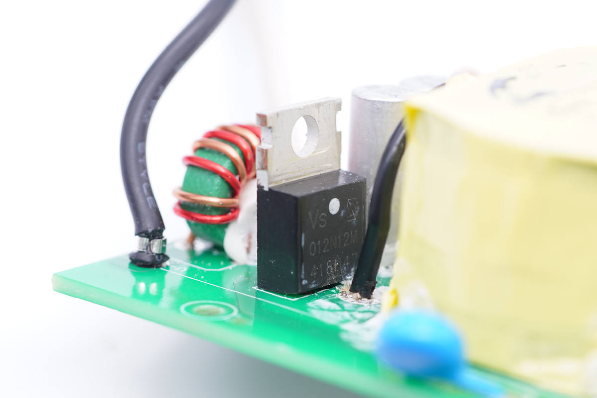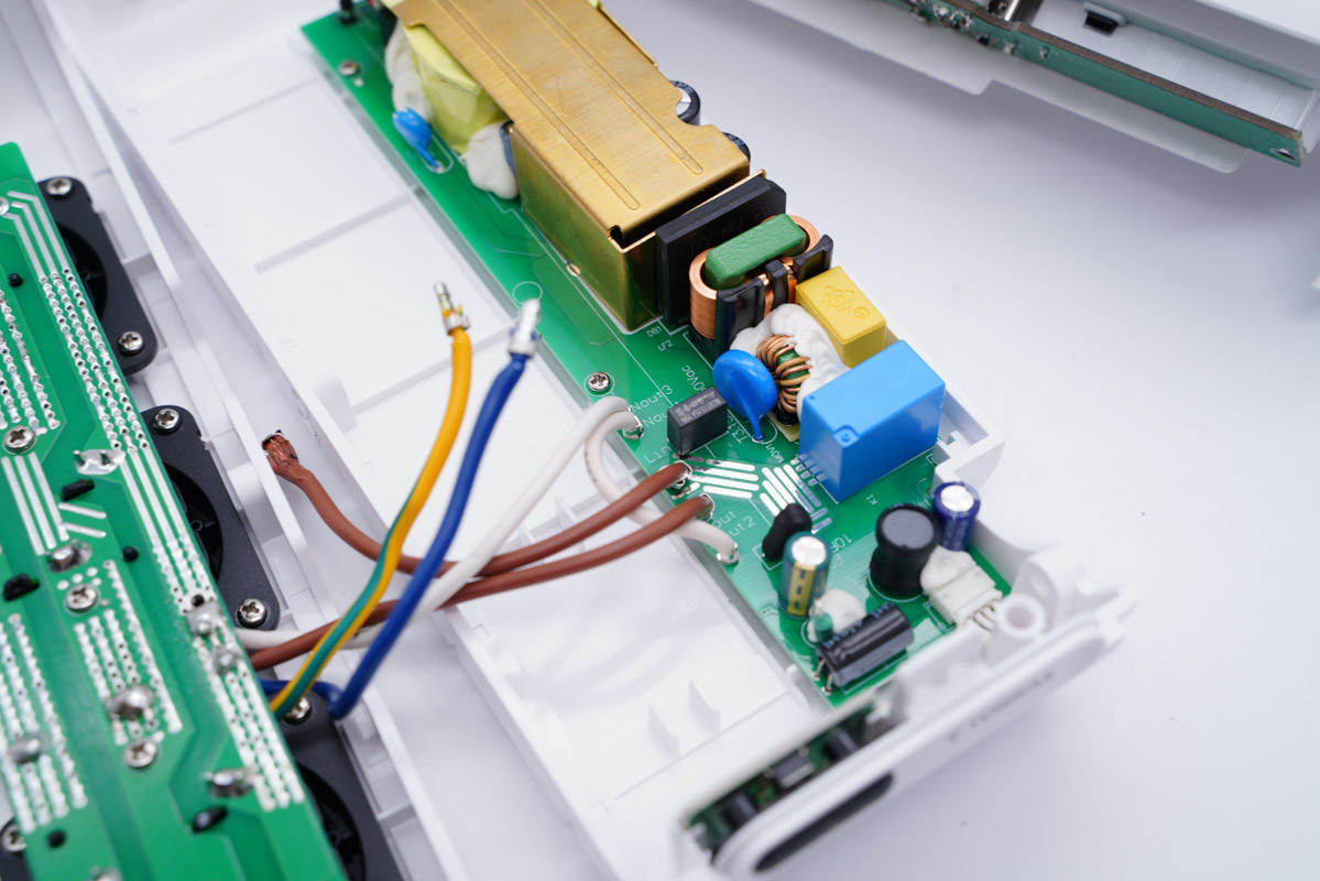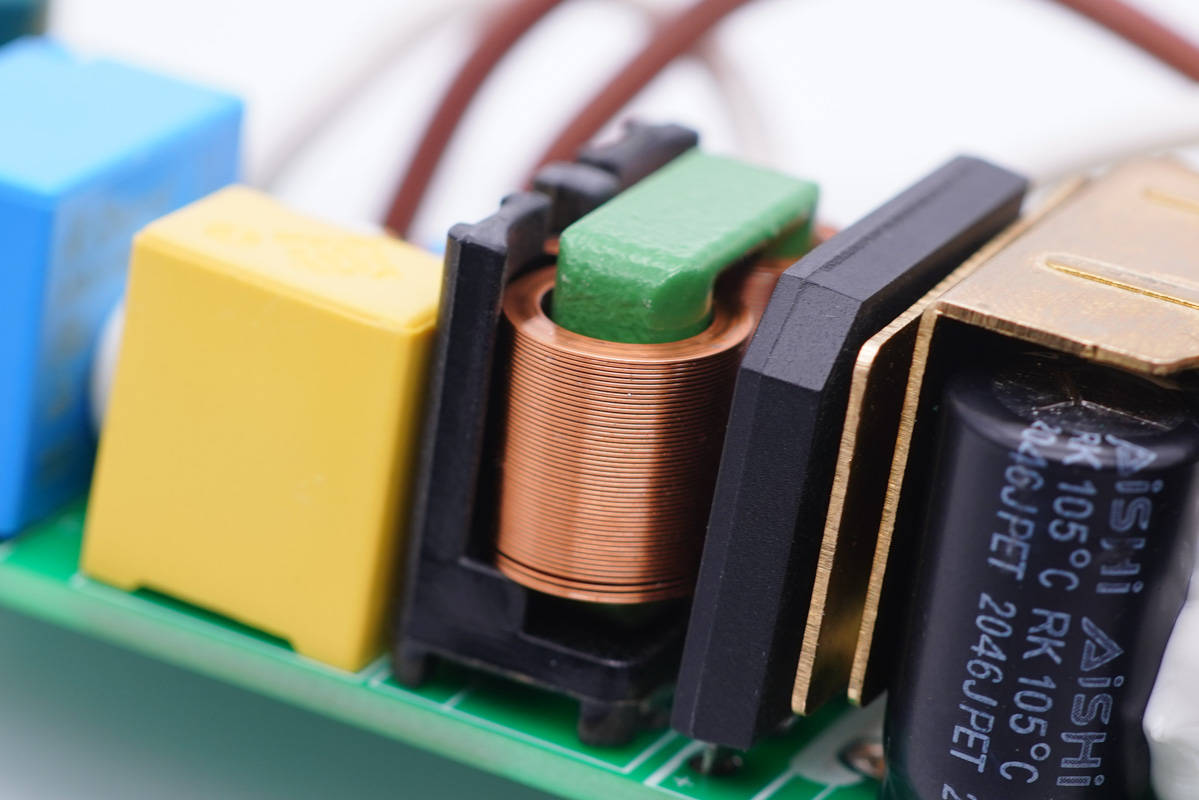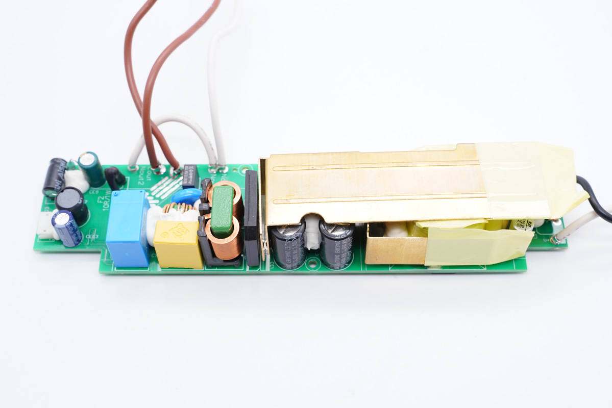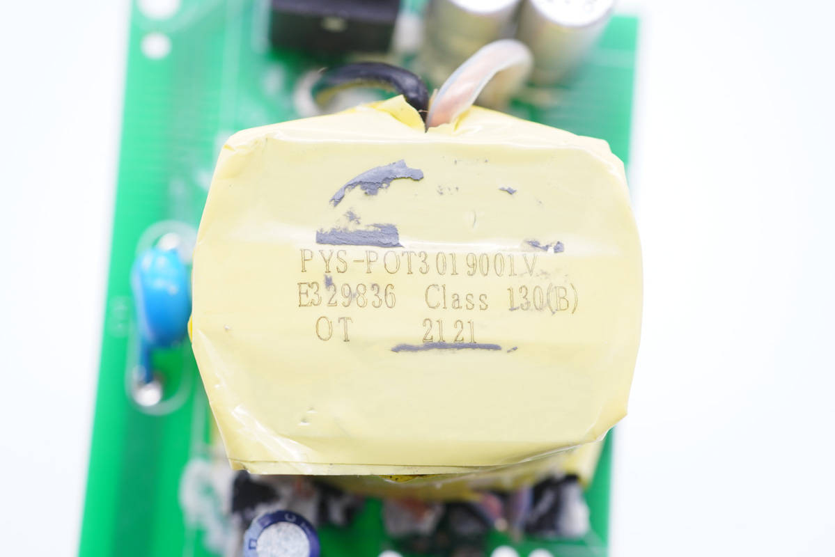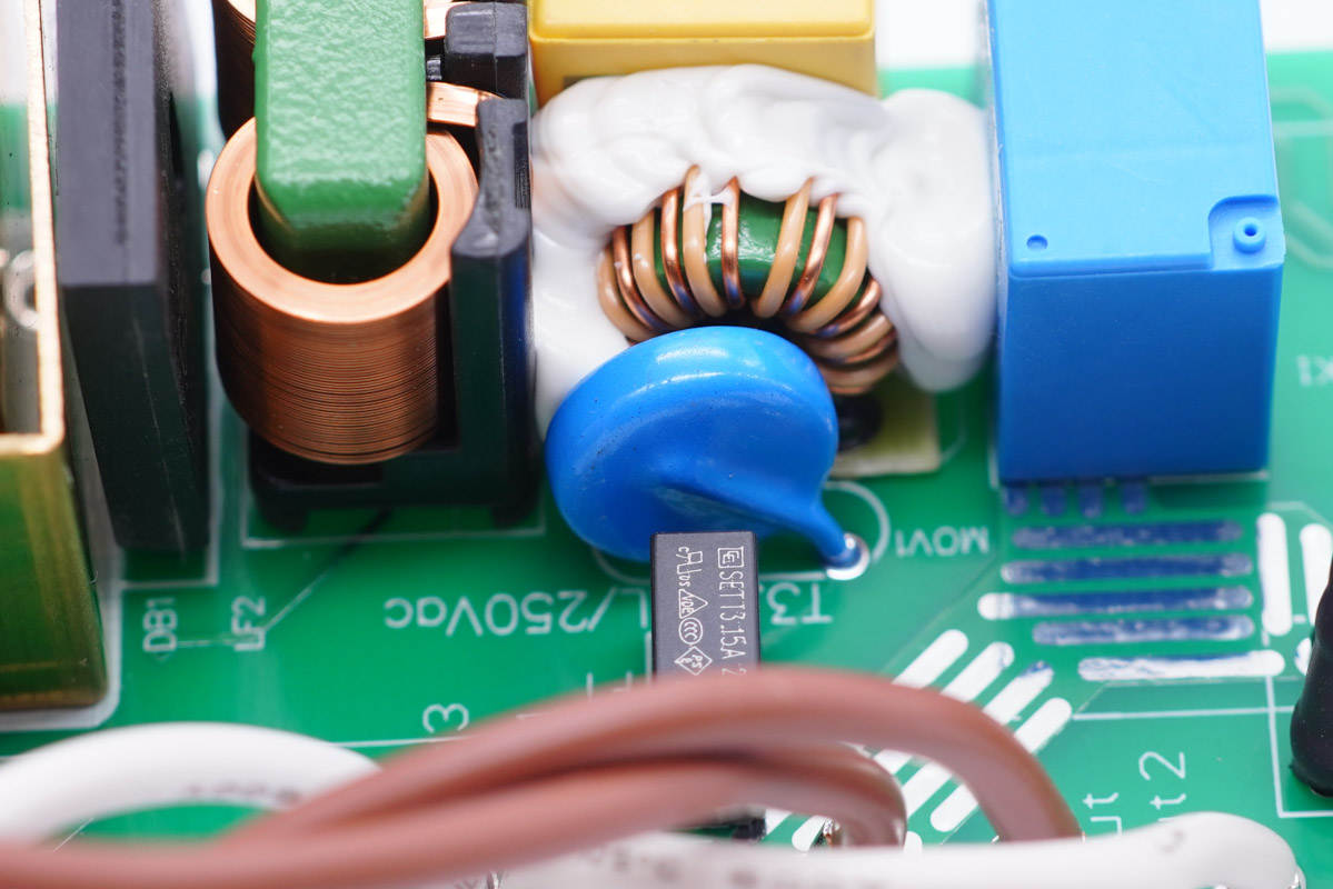 旁邊藍(lán)色的是壓敏電阻,中心的共模電感打膠,其左側(cè)還有一顆共模電感,兩級(jí)設(shè)計(jì)用于濾除EMI干擾。