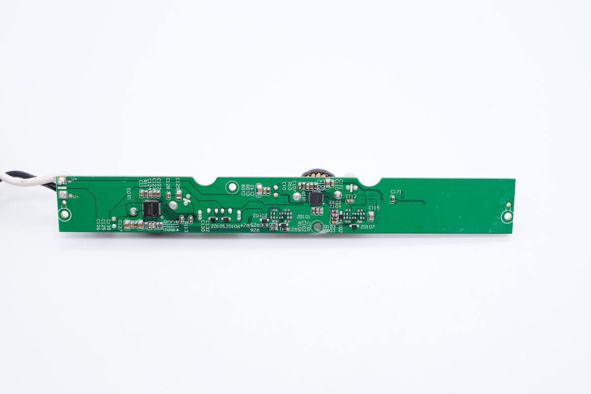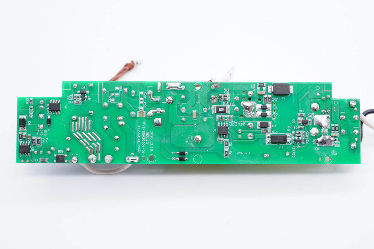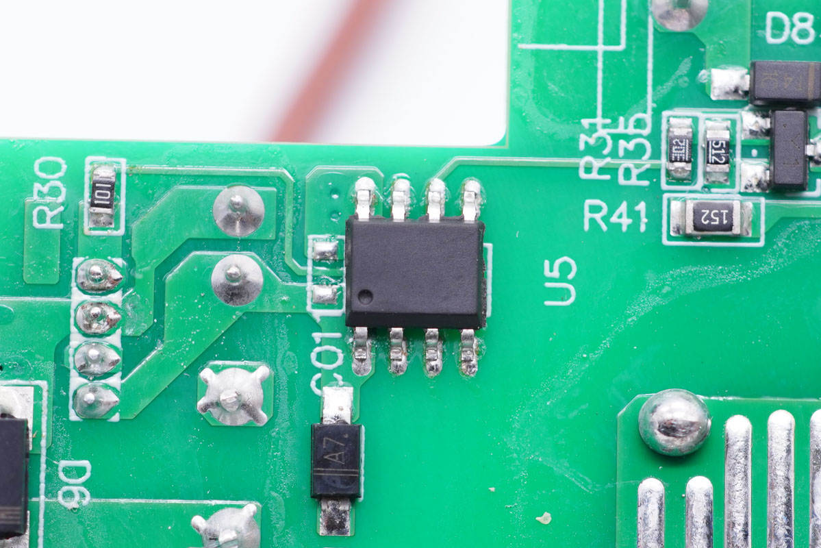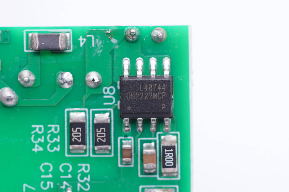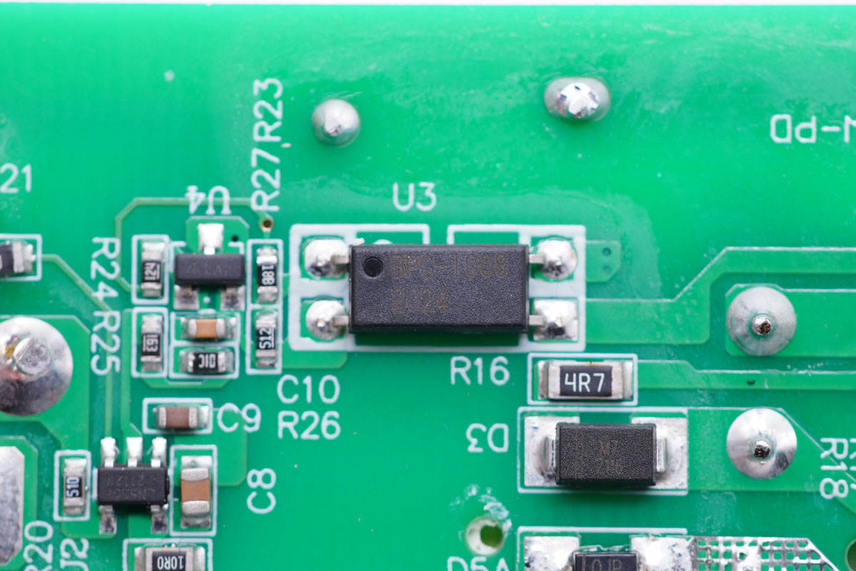 板子背面一覽,左側(cè)設(shè)有繼電器電路控制芯片,右側(cè)設(shè)有開關(guān)電源初次級(jí)控制器、光耦和貼片Y電容。
