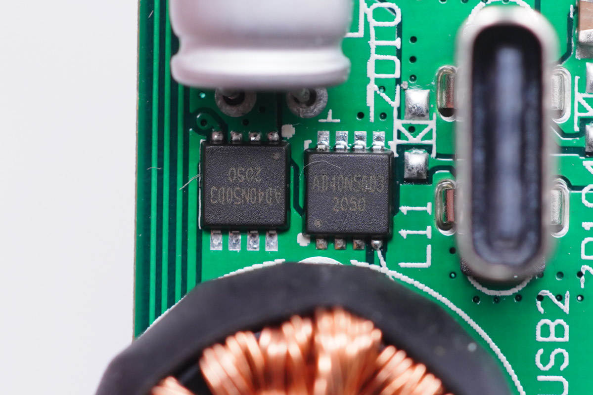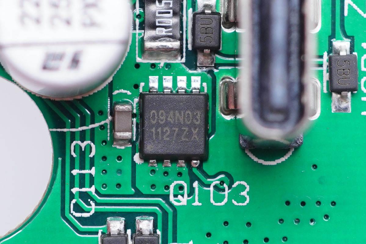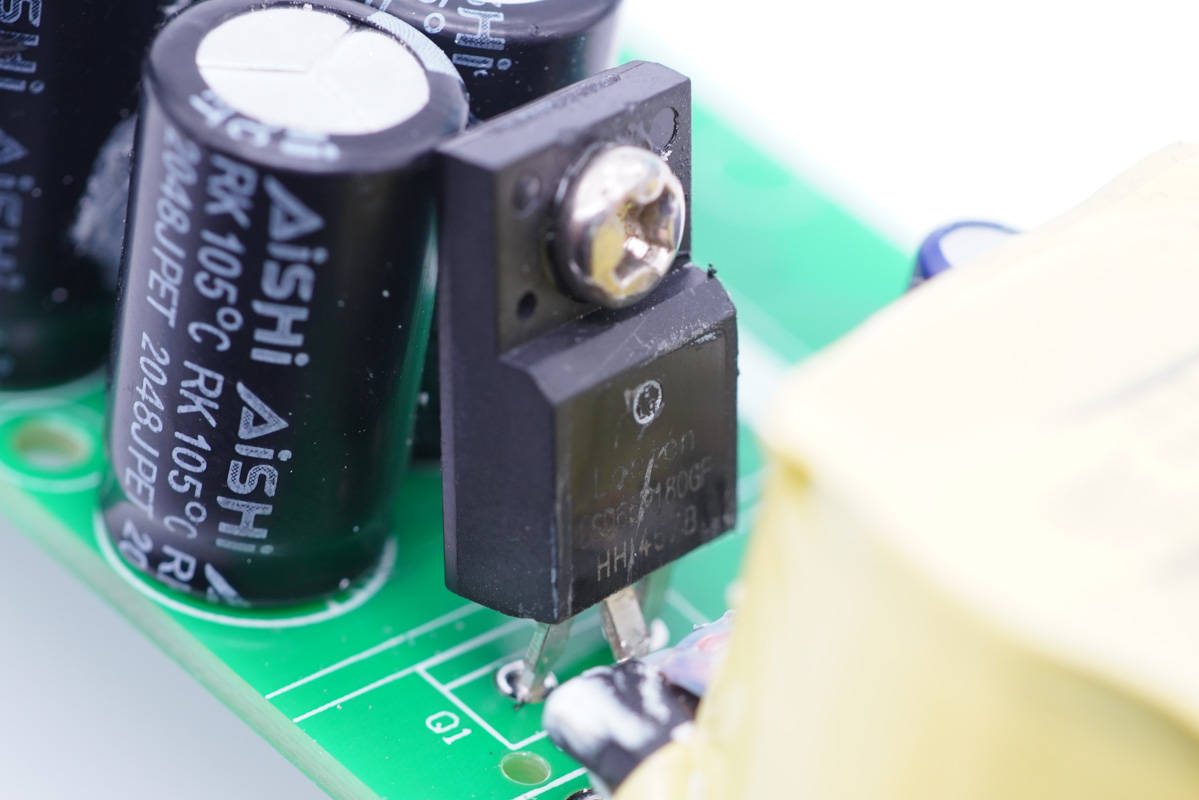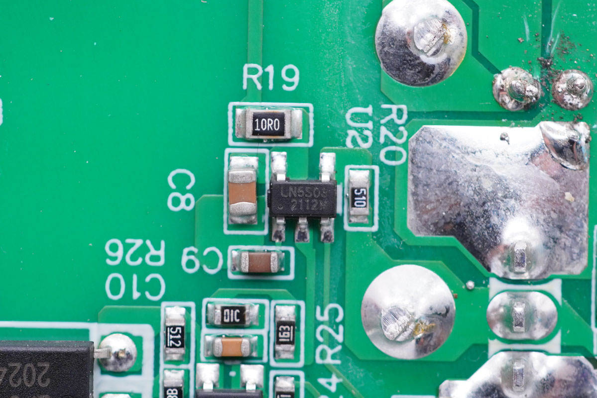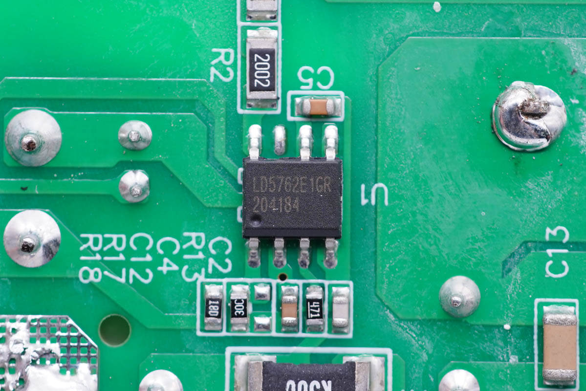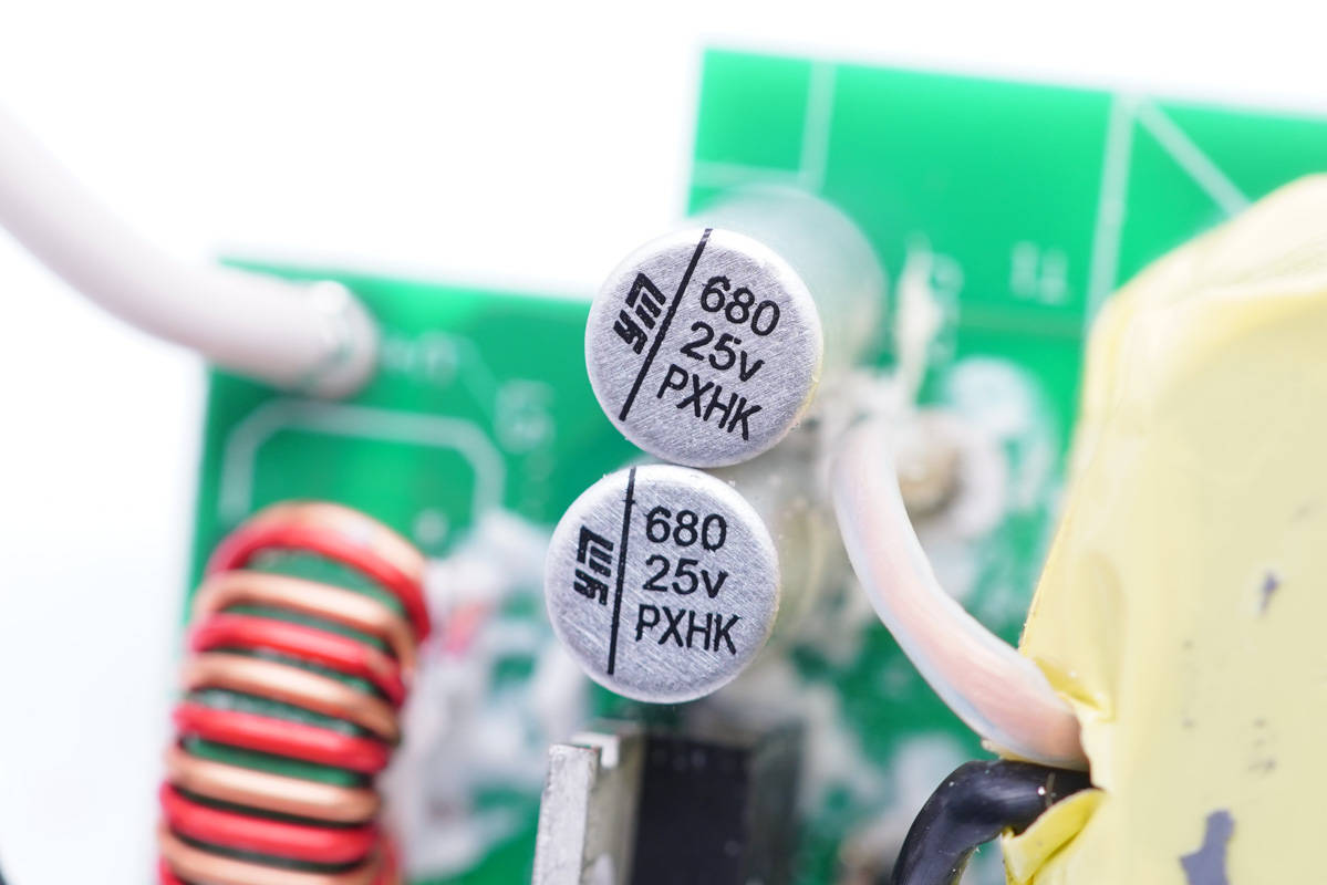 其中開關(guān)電源由通嘉LD5762E1搭配龍騰超結(jié)MOS管,以及力生美同步整流控制器搭配威兆VST012N12MS同步整流管組成,輸出端兩路二次降壓電路采用智融SW3516H和SW3517S方案。初級(jí)側(cè)采用四顆艾華電容濾波,次級(jí)側(cè)全部采用永銘NPX系列固態(tài)電容濾波,整體的用料十分可靠。