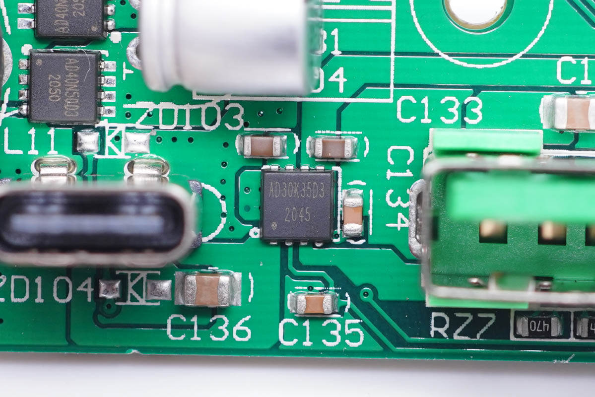 輸出端小板上設(shè)有兩路DC-DC二次降壓電路,其中C1口單獨(dú)一路,C2和A口一路。板子背面兩顆芯片便是兩路電路的主控芯片。