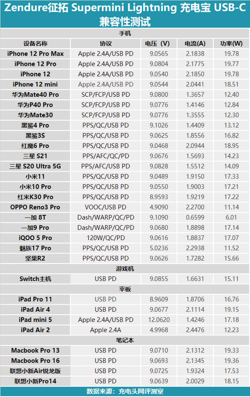 將輸出功率匯總成表,可以看到對 iPhone 12系列的支持非常好,均能達到19W左右,對其他支持PD充電協議的手機也能達到18W左右,只是對一加 8T 的兼容性較差一些。