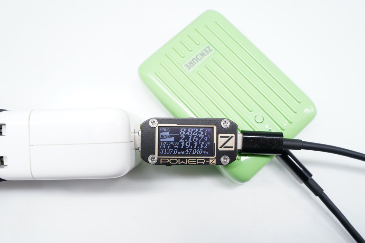 使用蘋果30W PD充電器為 Zendure 征拓 Supermini Lightning 充電寶充電,功率為8.82V 2.16A,19.13W。