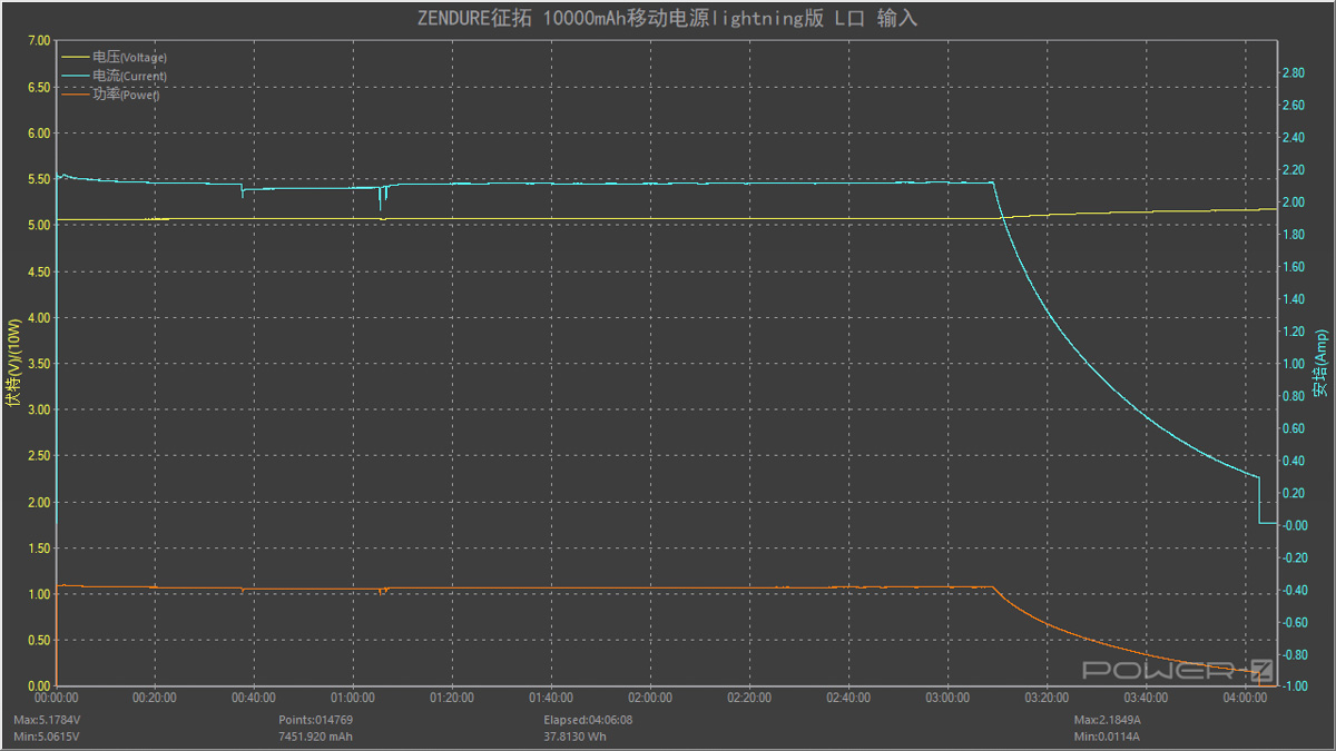 通過 Lightning 接口為充電寶充電,全程約耗時4小時06分,前3小時08分充電功率在10W左右,之后功率隨著充電寶電量增多逐漸降低。
