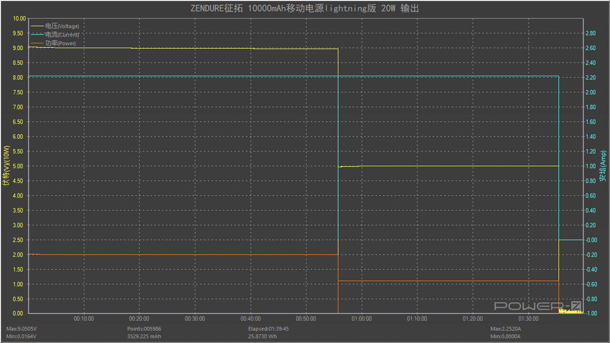使用9V2.22A PD檔位對充電寶進行輸出效率測試,充電功率在36分鐘左右就從20W掉到11W左右,全程持續約1小時50分鐘。