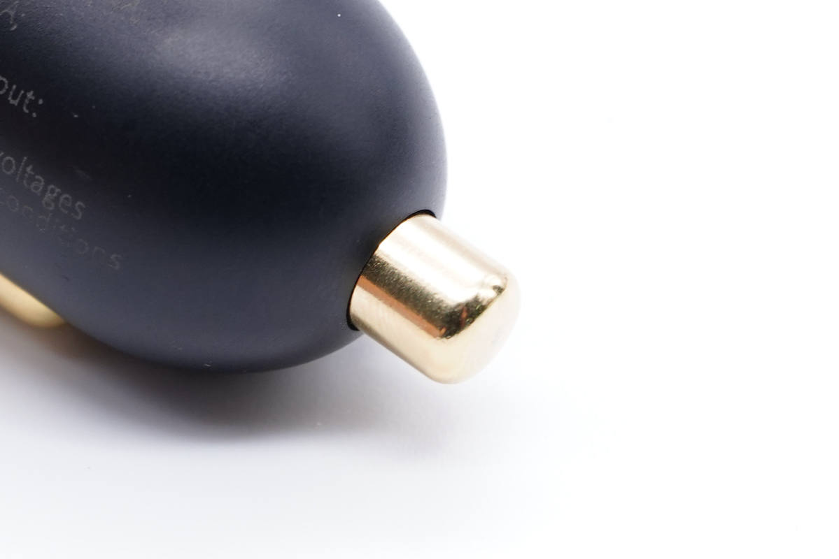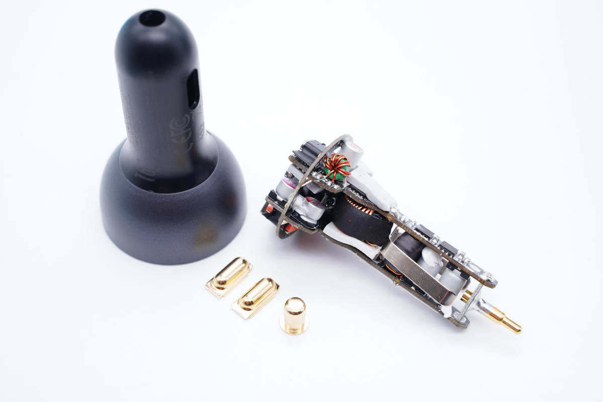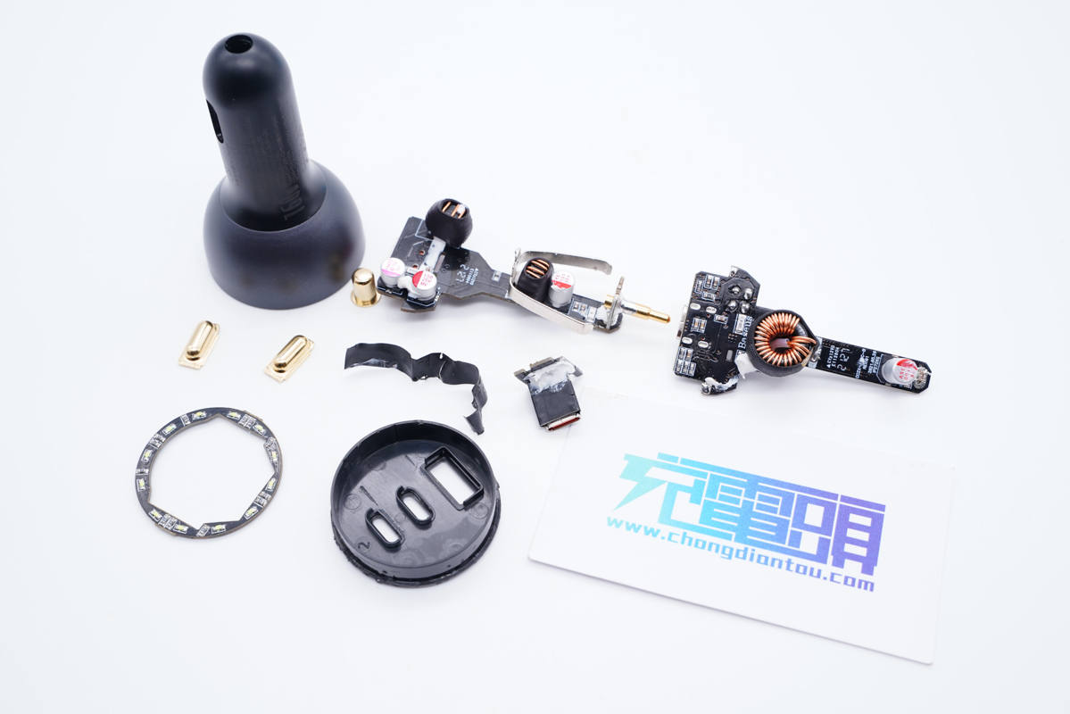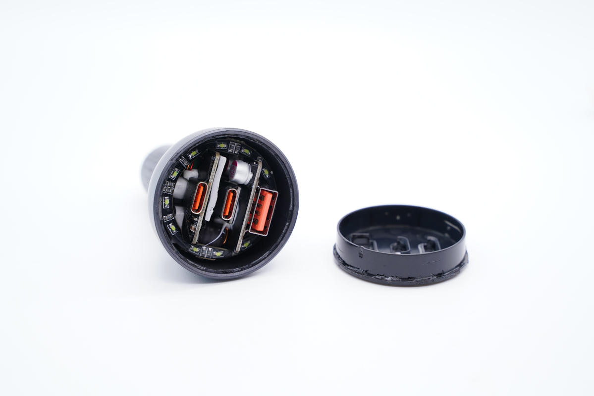車充由兩部分塑料殼拼接而成,整體造型像一個(gè)蓮蓬。上端部分外殼噴刷銀灰色涂料,看上去有金屬質(zhì)感。