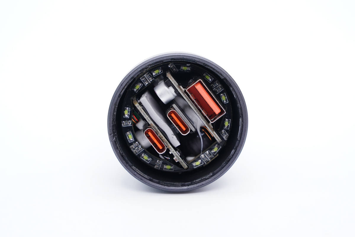 車充頂面邊緣設(shè)有氛圍導(dǎo)光圈,接通電源亮藍(lán)光,方便夜間環(huán)境使用。