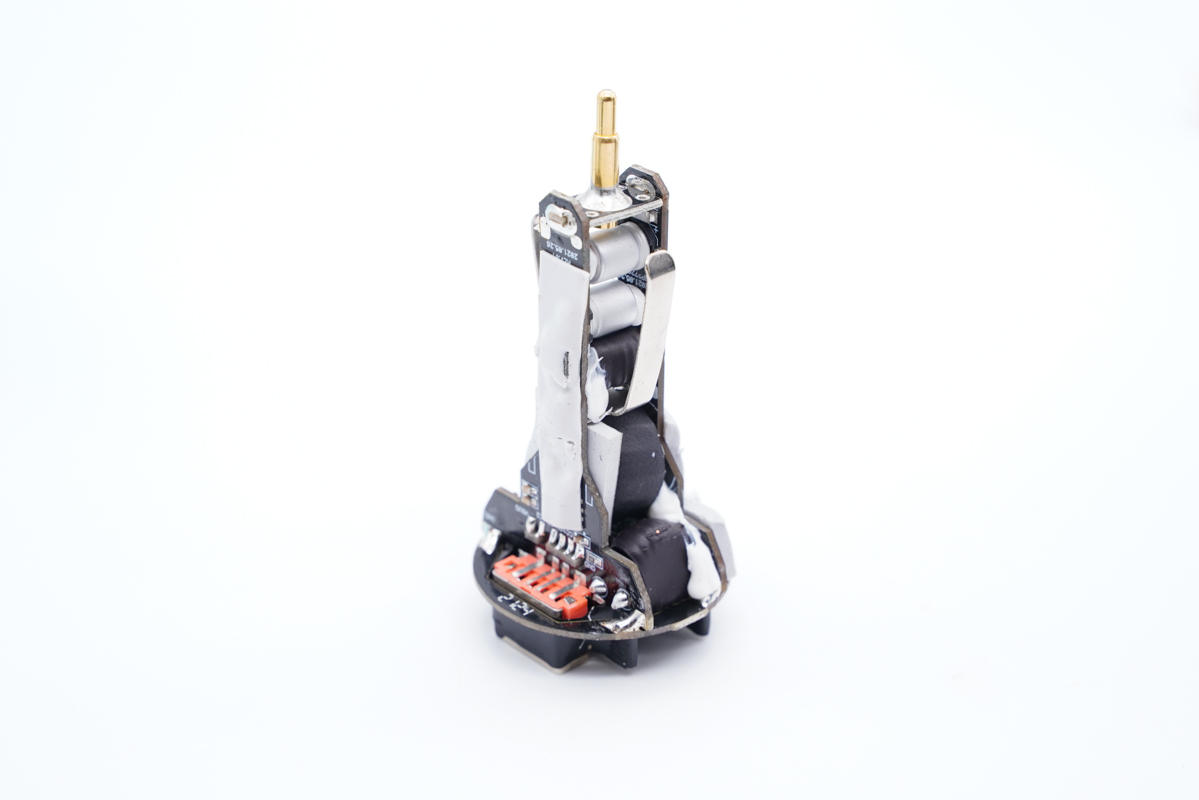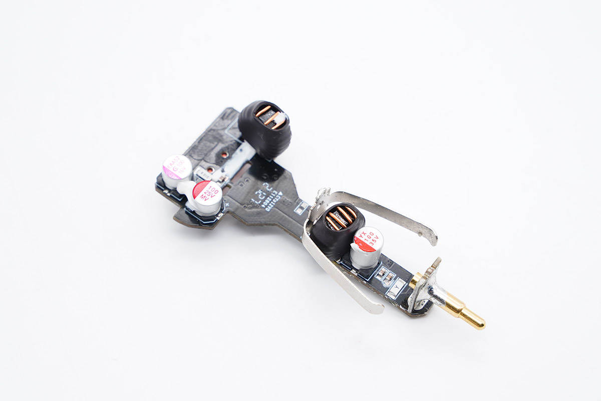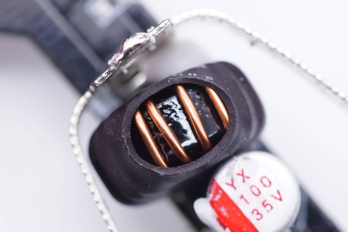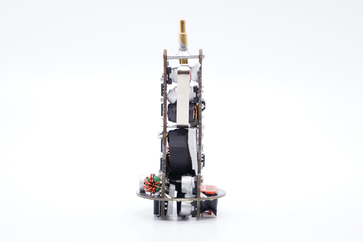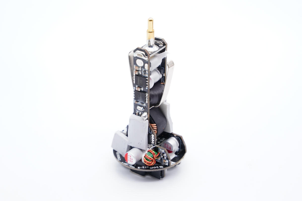 側(cè)面看去,兩塊電路板通過輸入端小板和負(fù)極金屬片錫焊連接,電感外套絕緣管保護(hù)。