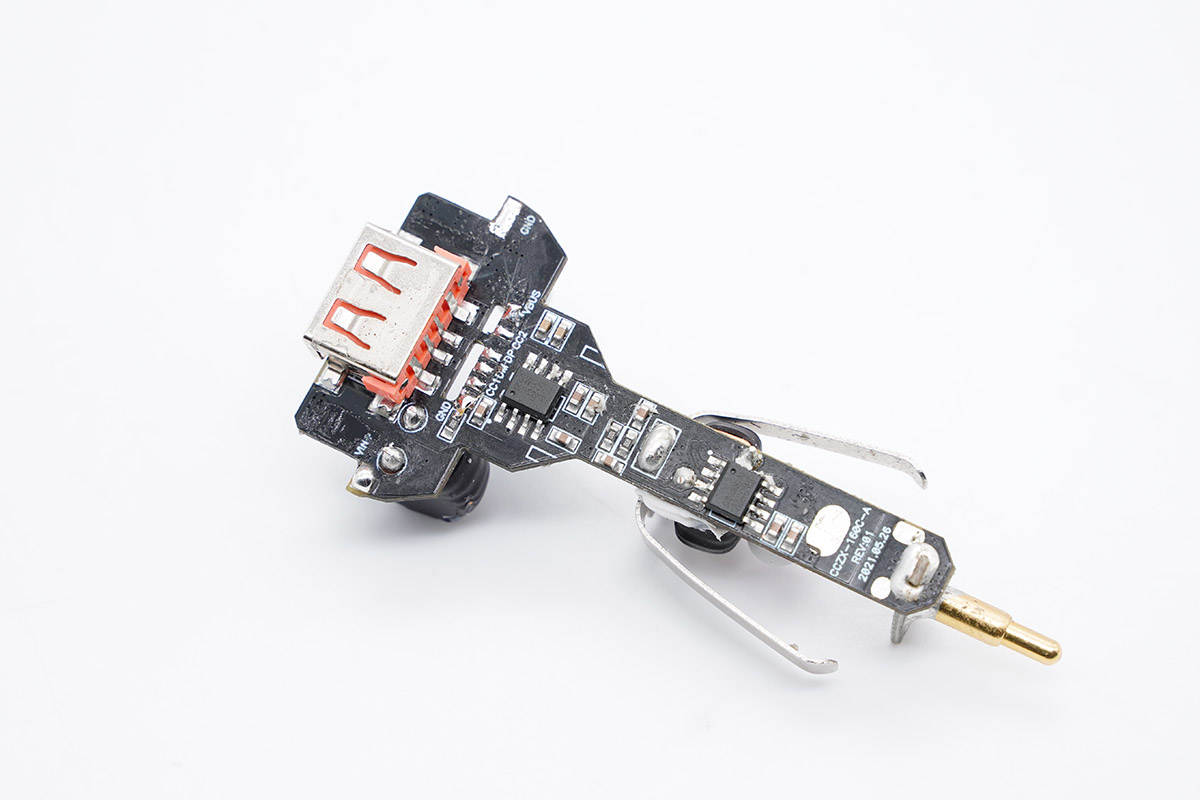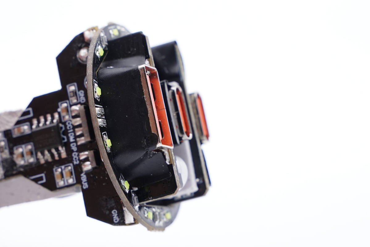 三個(gè)USB母座焊接在三塊小板上,之間有導(dǎo)熱墊填充,外圍是環(huán)形LED燈板。