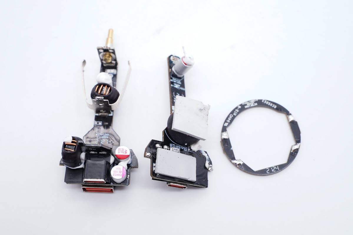 充電頭網(wǎng)通過拆解了解到,倍思這款車充由五塊PCB板小板組合焊接,兩塊主板上設(shè)有三路獨(dú)立升/降壓電路。其中USB-C1口采用寶礫微PL5501升降壓方案,英集芯IP2726S協(xié)議芯片控制輸出。