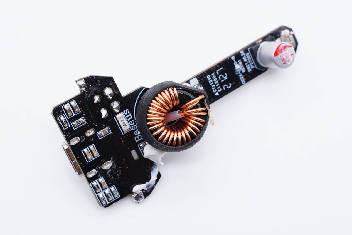 USB-C1母座所在小板正面設(shè)有升降壓控制器、四顆MOS管、輸出濾波電容和濾波電感、協(xié)議芯片,電容電感打膠加固。