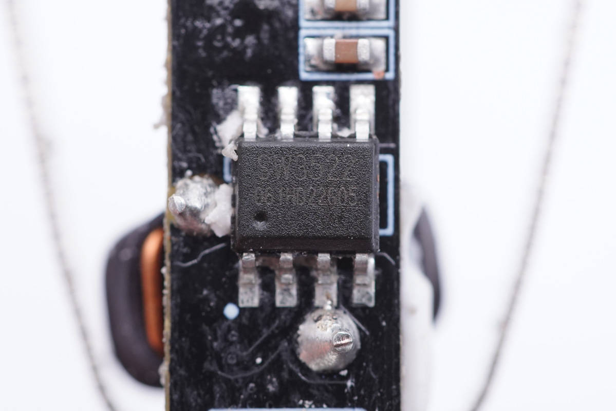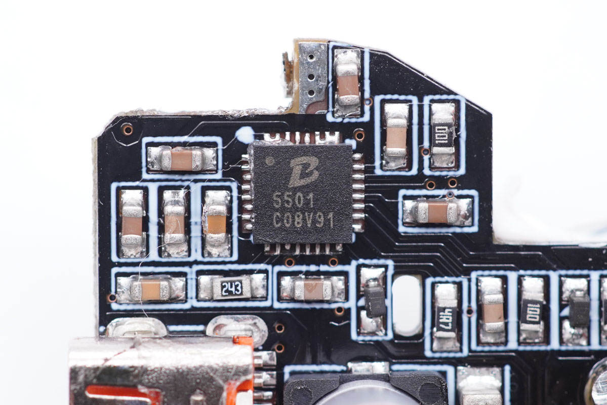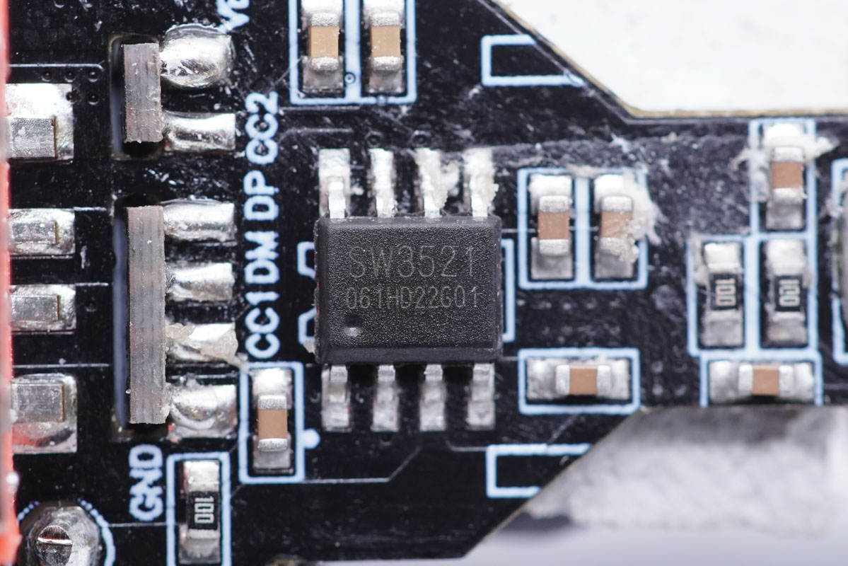 C2口和A口分別采用的智融SW3522和SW3521方案,進(jìn)行協(xié)議識(shí)別和降壓輸出。兩顆芯片都內(nèi)置高效率同步降壓轉(zhuǎn)換器,集成度非常高,這也是一塊小板上能同時(shí)設(shè)計(jì)兩路降壓電路的原因。此外設(shè)有云星和鈺邦固態(tài)電容進(jìn)行輸入輸出濾波,板子上也都貼有導(dǎo)熱墊均勻散熱,降低溫升。