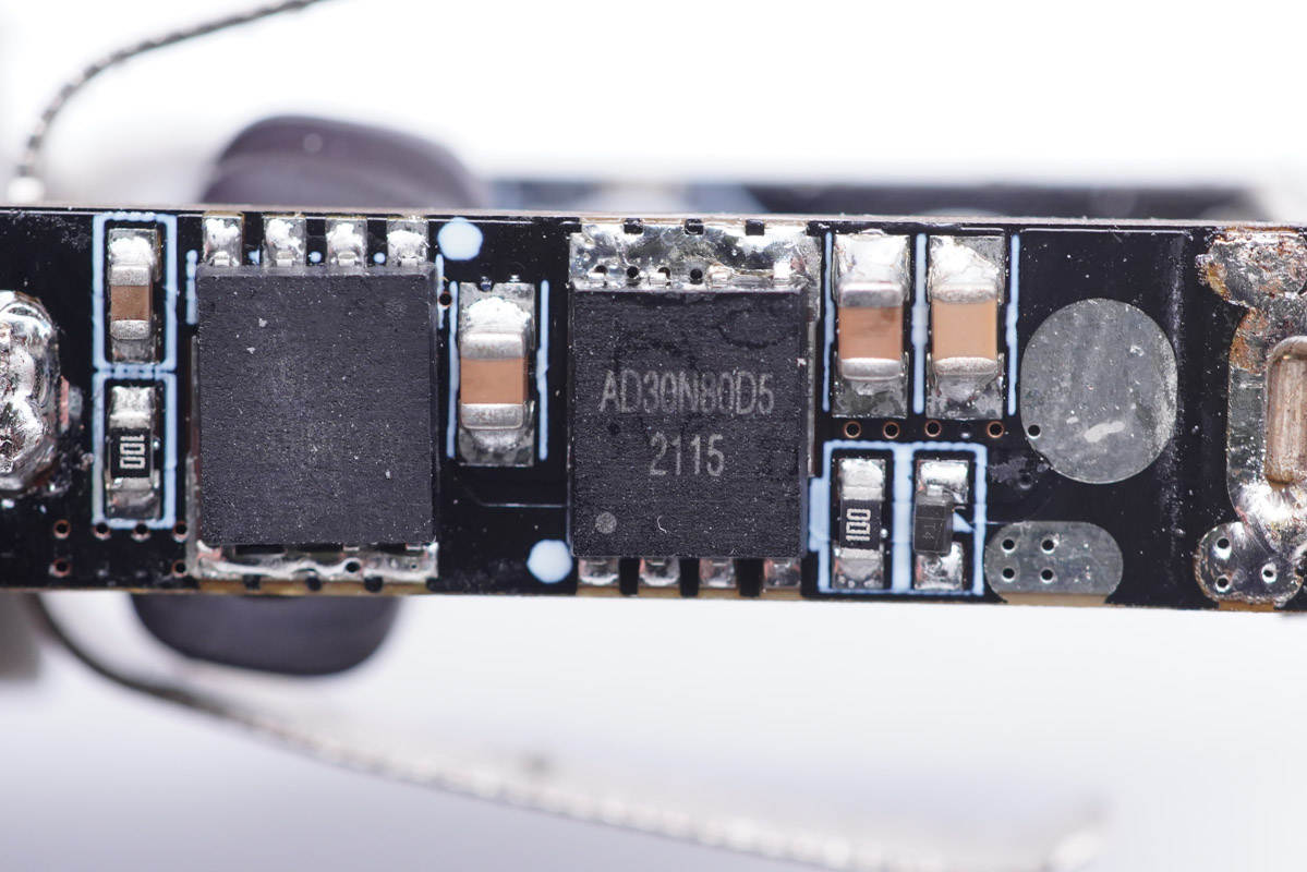 外掛四顆MOS管組成H橋,由PL5501驅(qū)動(dòng)。其中一顆是砹德曼AD30N80D5,耐壓30V,導(dǎo)阻2.1mΩ,HSOP8封裝。左側(cè)一顆絲印不清。