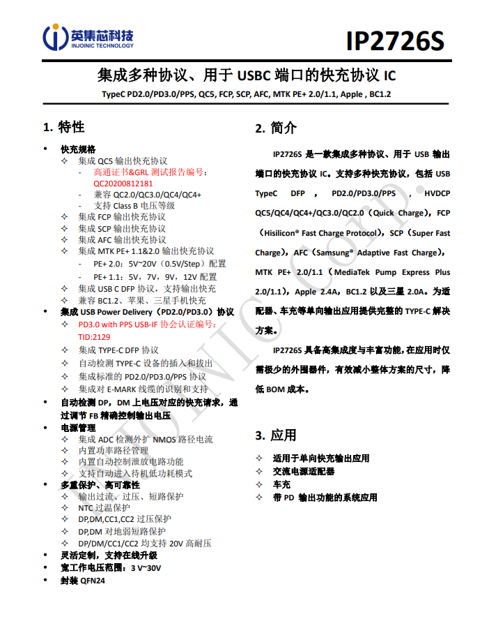IP2726S是一顆集成多種協(xié)議、用于USB輸出端口的快充IC,支持Type-C DFP、PD2.0/3.0、PPS、QC5、QC4/4+、QC2.0/3.0、FCP、AFC、SCP、MTK PE+、Apple2.4A、BC1.2以及三星2A等協(xié)議。具有高集成度和豐富的功能,在應(yīng)用時(shí)僅需極少的外圍器件,有效減小整體方案的尺寸,降低BOM成本。