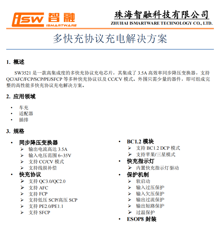 A口降壓協(xié)議IC采用智融SW3521,這是一款高集成度的多快充協(xié)議充電芯片,其集成了3.5A高效率同步降壓變換器,支持 QC/AFC/FCP/SCP/PE/SFCP等多種快充協(xié)議以及CC/CV模式。外圍只需少量的器件,即可組成完整的高性能多快充協(xié)議充電解決方案。