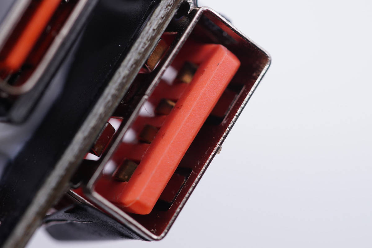 車充頂面高光亮面設(shè)計(jì),配有時(shí)下熱門的2C1A三個(gè)接口,均采用紅色膠芯,C1口旁還印有100W和高通QC5認(rèn)證標(biāo)識(shí)。