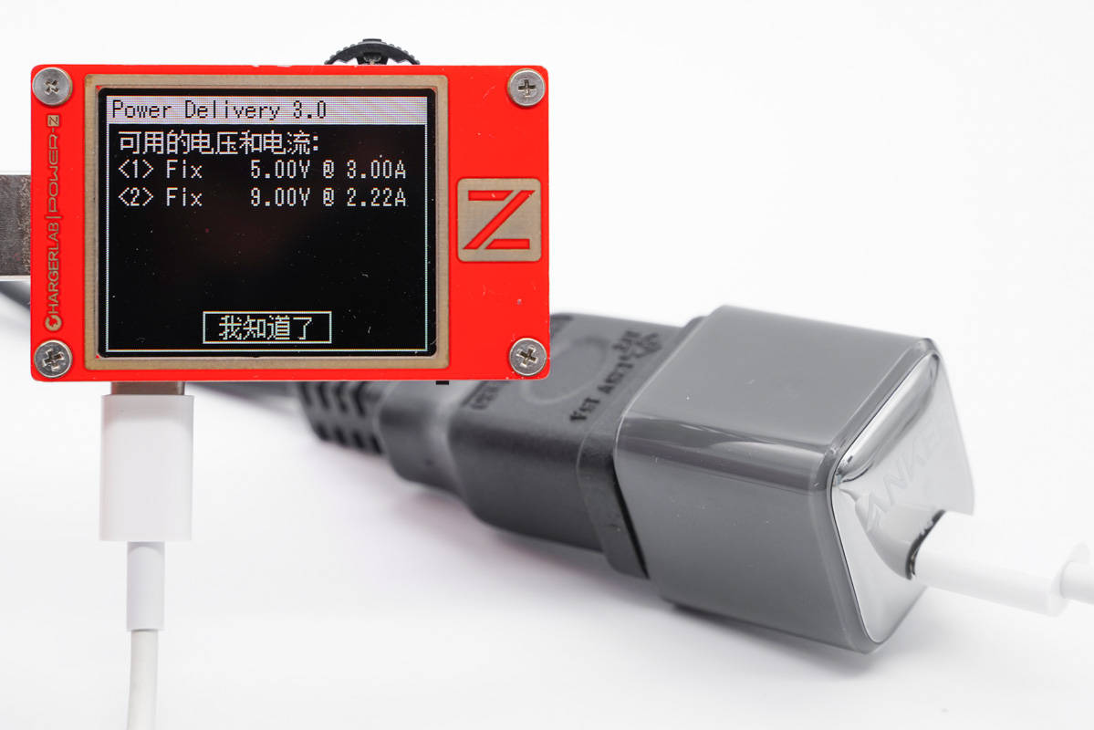 使用ChargerLAB POWER-Z KT002測得USB-C口支持Apple 2.4A、Samsung 5V2A和DCP協議,以及QC2.0、QC3.0、PD3.0快充協議。
