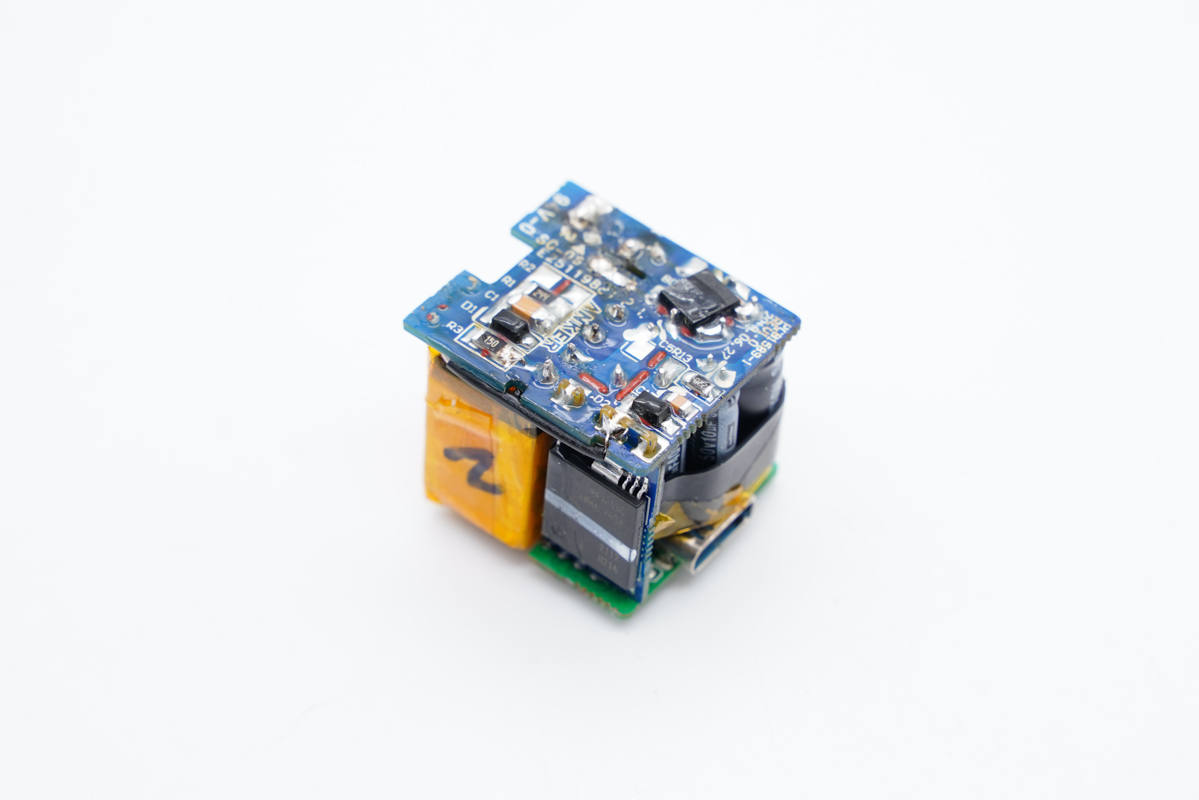 模塊采用的是時下熱門的三塊小板組合焊接設計,U型結構,夾層間放置電容、變壓器等器件,最大化利用內部空間,讓安克這款安芯充體積達到迷你級別。