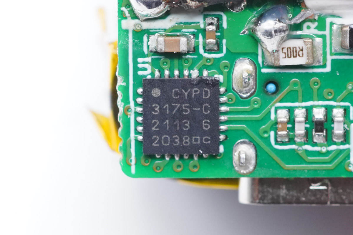 USB PD協議芯片采用英飛凌CYPD3175-24LQXQ。這款芯片支持1A1C接口,支持QC4.0和其他快充協議,集成次級反饋和輸出電流檢測放大器,內置多重完善的系統級保護,內置32位MCU,內置時鐘,支持3-24.5V寬泛的工作電壓范圍。
