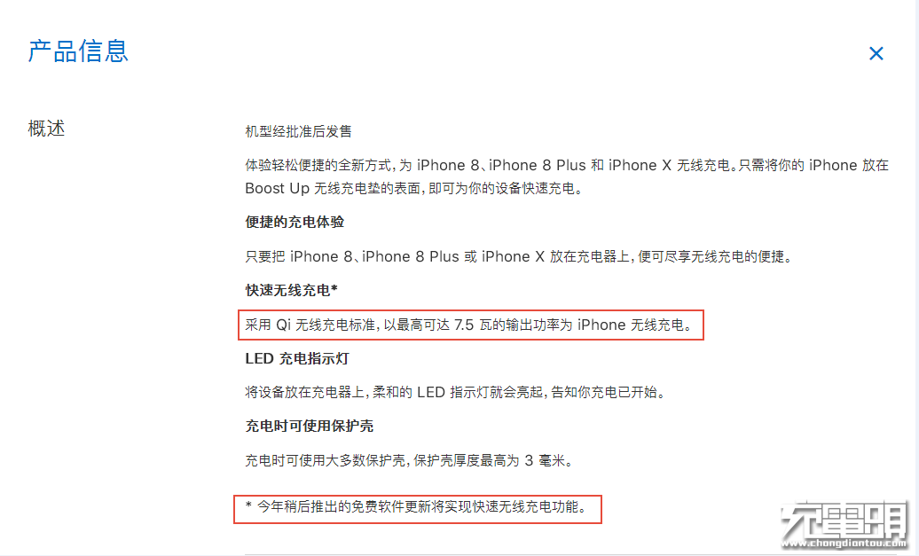 值得一提的是,這個7.5W功率跟市面上主流的Qi 無線充電器參數均不一樣;即使蘋果開放支持Qi標準,非蘋果認證的配件充電功率僅停留在5W左右;需要享受到7.5W的無線快充,只能購買售價上千元的AirPower,或者是Belkin、mophie的認證配件,也能提供7.5W快充。