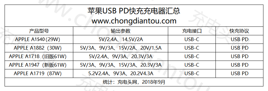 據(jù)充電頭網(wǎng)統(tǒng)計(jì),截止目前蘋果官方推出的USB PD快充充電器共有A1540(29W)、A1882(30W)、A1718(舊版61W)、A1947(新版61W)、A1719(87W)五個型號。加上市面上已有的第三方USB PD充電器,將形成豐富的充電器產(chǎn)品類目供用戶選擇。