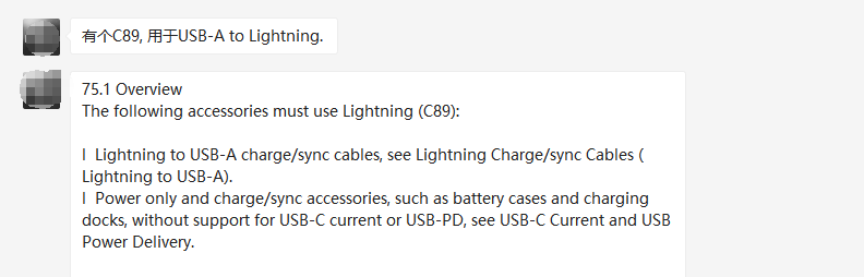 Lightning to USB-A充電/同步電纜必須使用C89連接器,該型號連接器不支持USB PD快充協(xié)議。