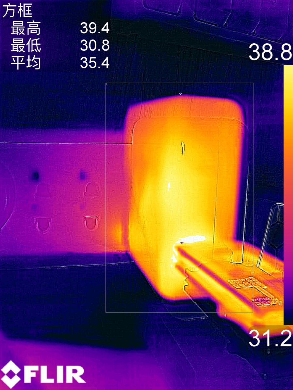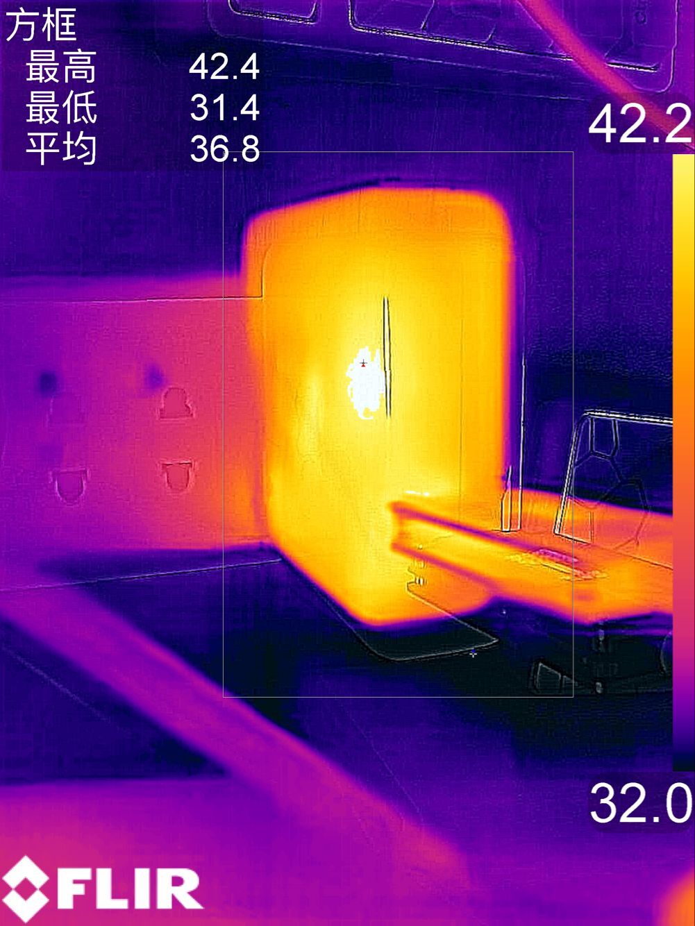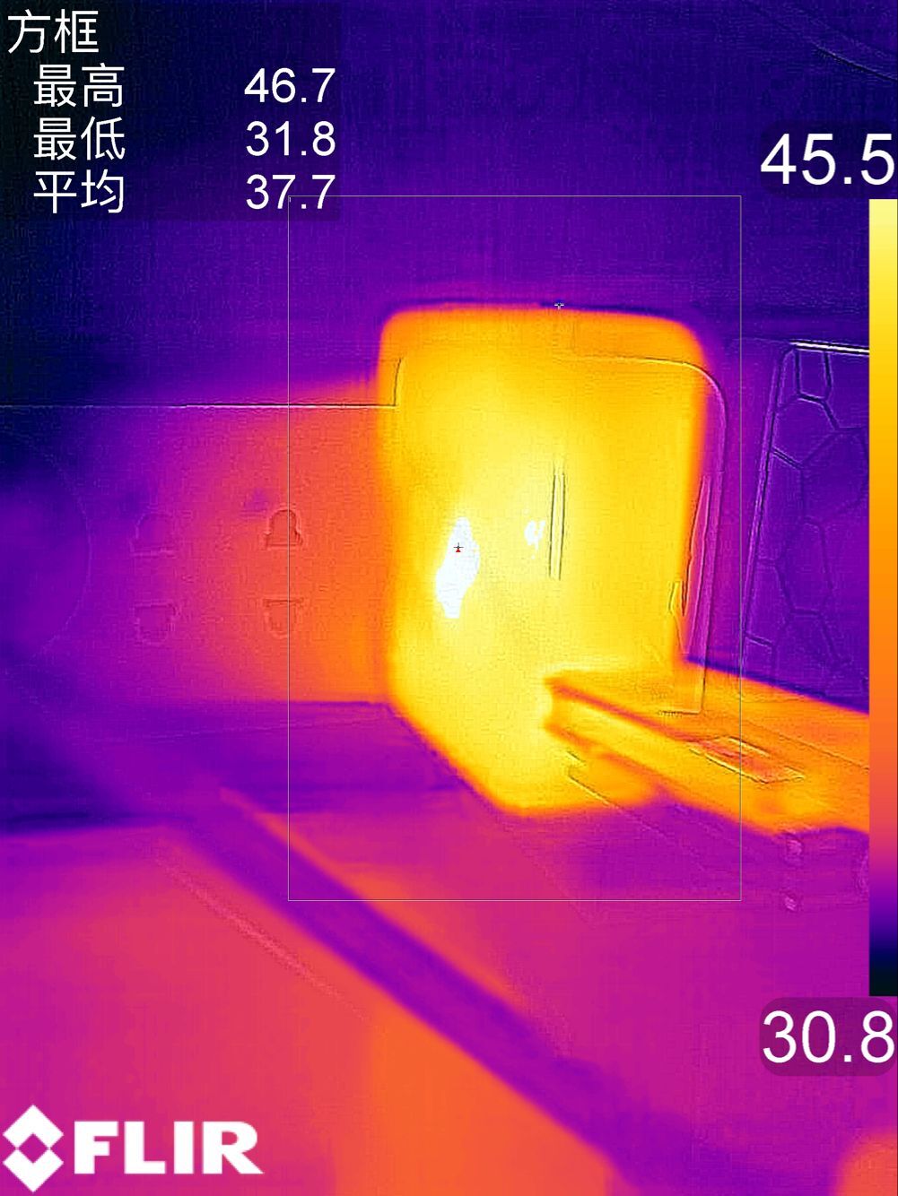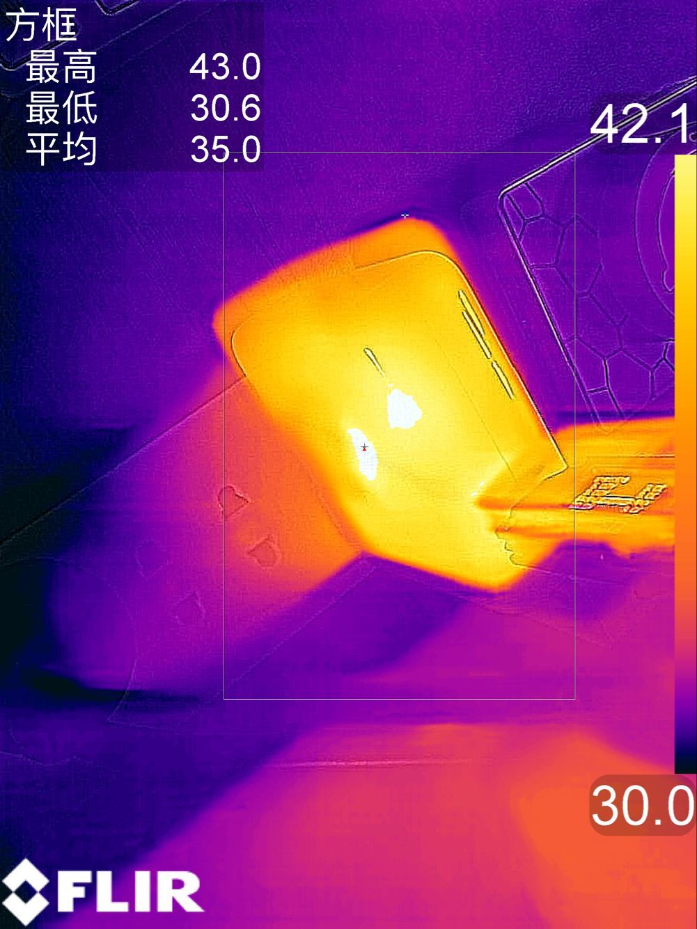 發熱方面,使用誘騙儀對充電器進行檔位誘騙,室內溫度30℃左右,持續負載10分鐘。對于每個輸出檔位發熱的情況,利用了FLIR溫度測試儀測得溫度: