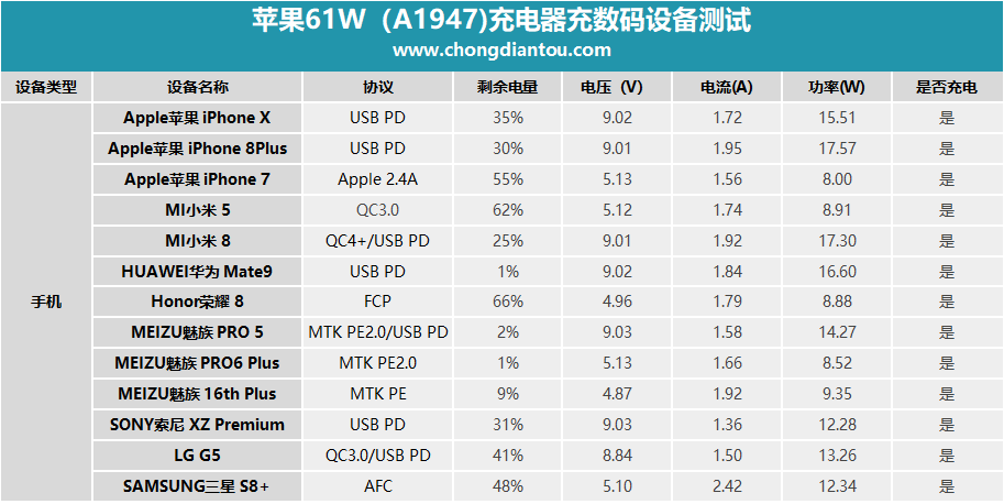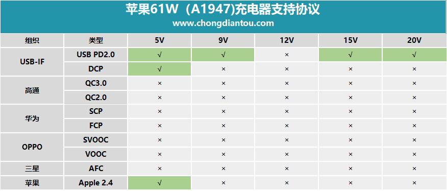 蘋果61W充電器支持充電協議一覽。