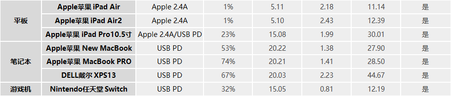 不僅能充手機,平板、筆記本、游戲機都可以充。iPad Air、iPad Air2都順利握手了Apple 2.4A協議,iPad Pro則優先握手USB PD快充,電壓為15V檔,功率達30W;筆記本方面,三款筆記本都進入了20V檔位的USB PD快充;而近期比較火的Switch游戲機也進入了15V檔位的USB PD快充。