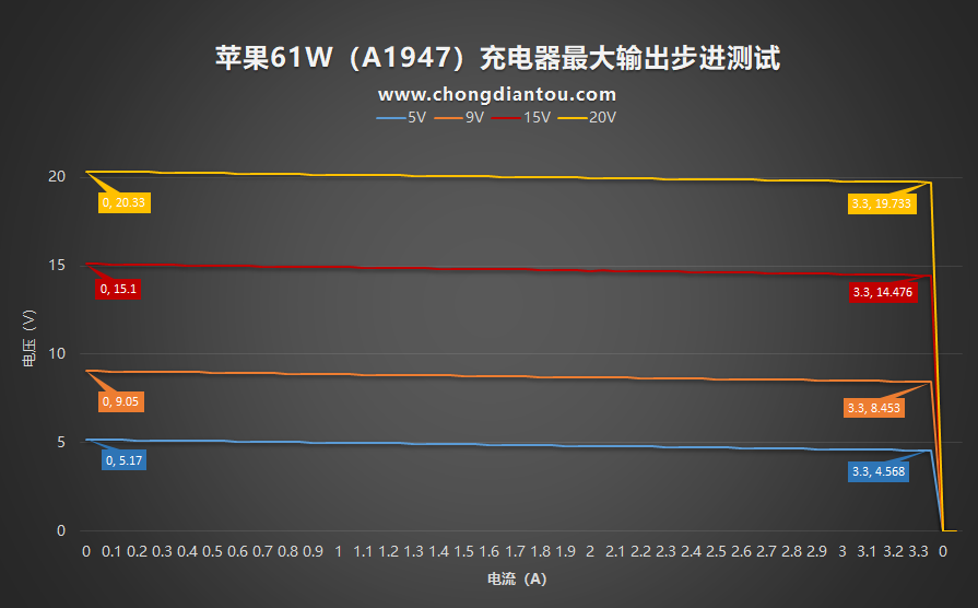 首先是最大輸出測試。依次設置了充電器的四個電壓檔位,電流從0A開始遞增,每次遞增0.1A,測試結果很相似,四個輸出檔位的最大輸出電流都為3.3A。隨著電流的增大,電壓逐漸降低。從圖中可以看出來,蘋果61W充電器的最大輸出可達65.1W(19.73V/3.3A),比標稱功率大了4.1W,預留了4W左右的余量。