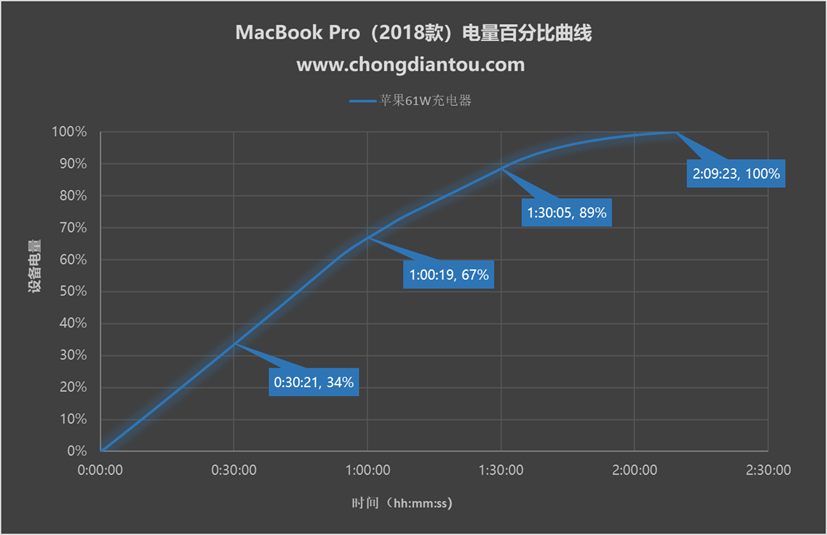 在充電功率變化方面,并沒有充MacBook Pro 13英寸(2018款)時那么穩定。最高功率達到了16W多,但是持續不長;前半個小時,大致功率呈現一個上升狀態,半小時后功率開始下降,在43分鐘左右,電量達到了70%左右,功率呈現直線下降,功率幾乎為0;持續一段時間后,在1小時左右時,功率恢復為5W左右,直至1小時20分左右開始緩慢下降,最終在2小時27分功率為零,電量充滿。