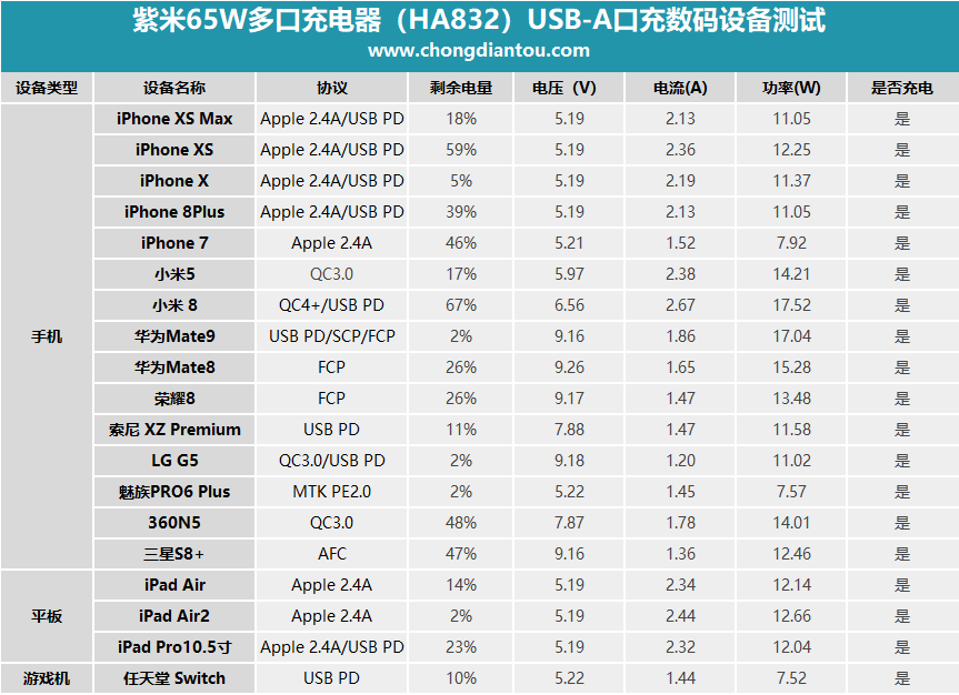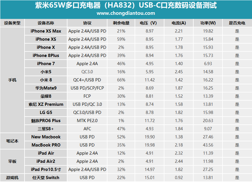 二、ZMI紫米65W多口充電器測試