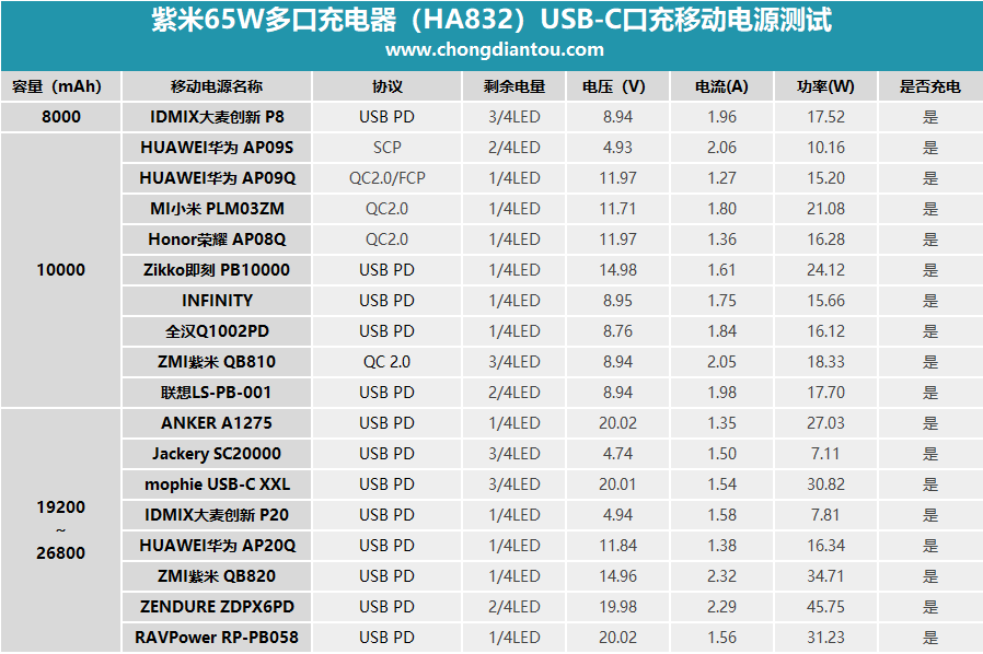 充紫米QB810移動電源,功率達到了19.01W,握手QC快充。