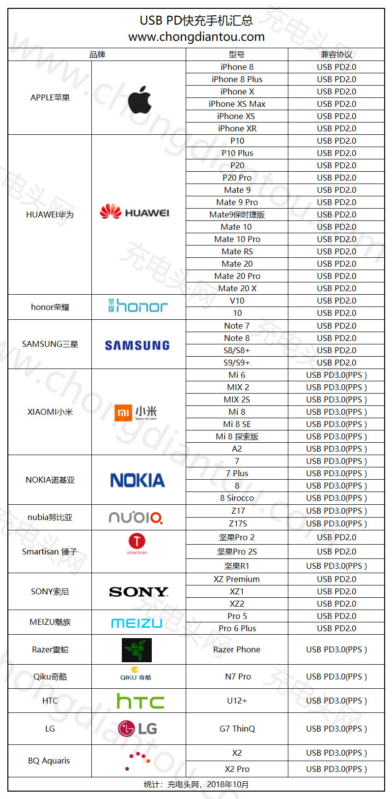 據充電頭網不完全統計,截止2018年10月23日,市面上支持USB PD快充的手機以及達到52款,另有20款手機支持USB PD3.0(PPS)快充。