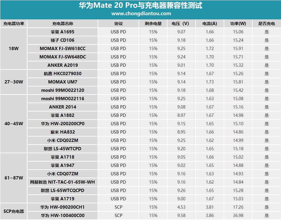 全部充電器兼容性測試做成了表格,方便大家觀看。