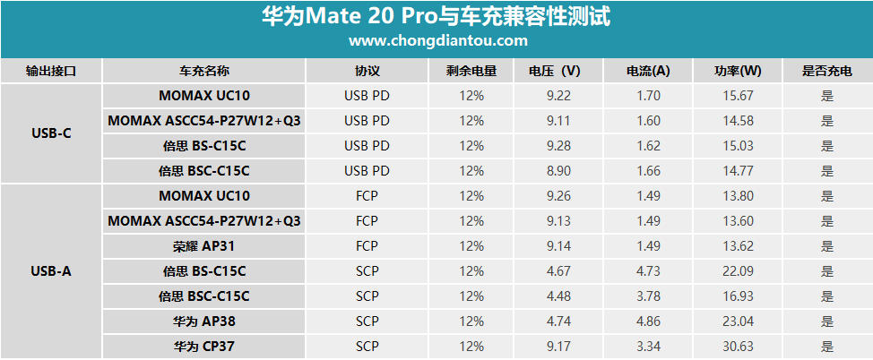 導航軟件非常不錯,大多數老司機在開車的時候都會開著,避免路線出錯,給我們出行帶來了方便。但是導航軟件是手機內的“電老虎”,開著導航,手機掉電特別快,這就需要一個車充為手機提供續航,尤其是帶有快充的車充。市面上車充繁多,兼容性有好有壞,小編挑選了幾款常見的車充對華為Mate 20 Pro做了兼容性測試,分為USB-C口和USB-A口兩部分,測試結果如下: