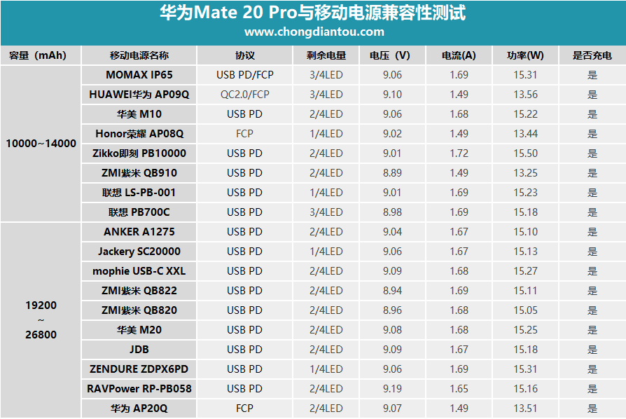 移動電源是生活中的必需品,我們越來越離不開它,如果出門沒帶移動電源,一整天都會心事重重,如果帶了移動電源卻發現不能給自己新買的愛機充電,估計會瘋掉。下面來測試華為Mate 20 Pro與各品牌移動電源的兼容性,大家可作為選購參考。
