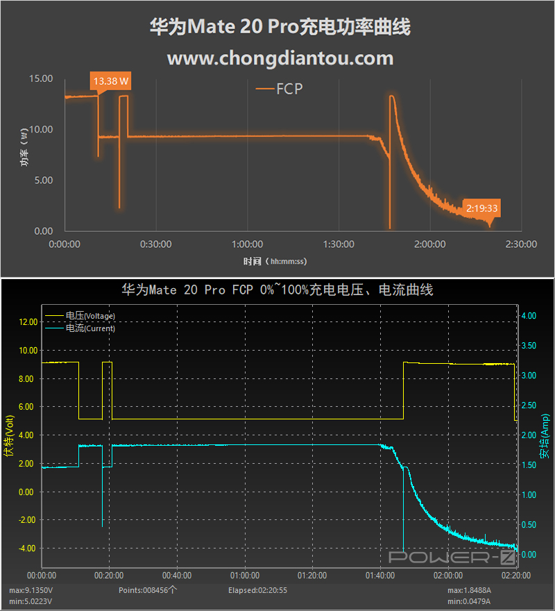 使用榮耀(AP31)車充的USB-A口充華為Mate 20 Pro,FCP快充開啟。此次充電的電壓、電流、功率曲線變化情況跟PD快充非常相似,手機同樣握手9V檔位充電,隨后大部分時間維持在5V充電,功率9W左右。最高功率出現在10分鐘左右,達13.38W,全程充滿耗時2小時19分鐘。