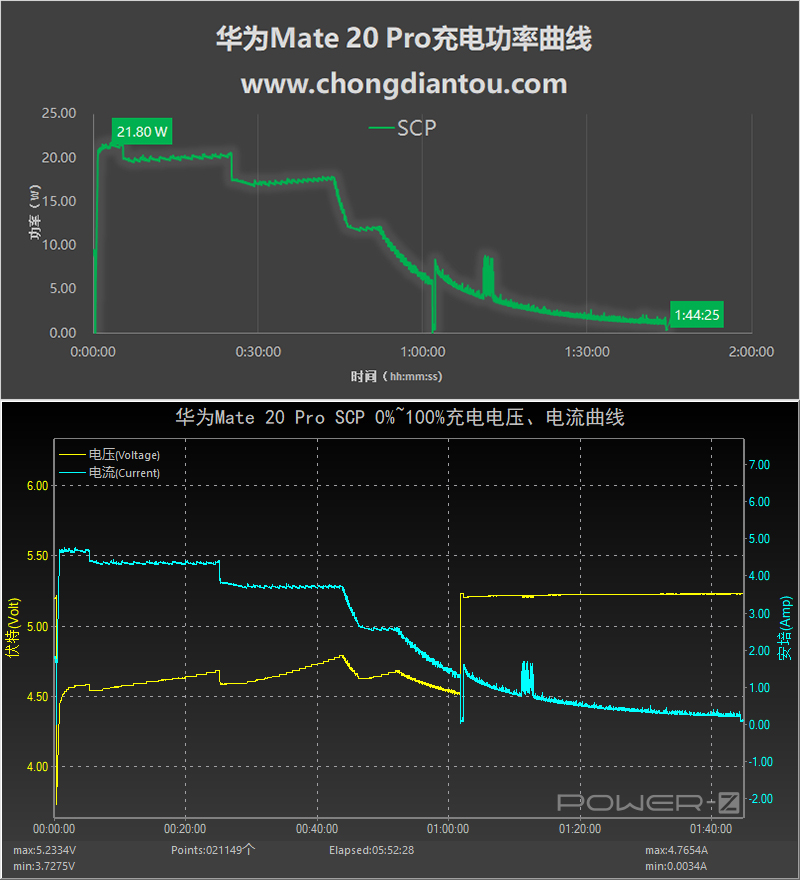 使用華為(HW-090200CH1)充電器的USB-A(紫色)口充華為Mate 20 Pro,SCP快充開啟,開頭1分鐘,握手SCP成功,電壓沖3.7V緩慢上升到4.4V,并沒有像FCP、PD快充那樣直接蹭的一下上去,大約充了5分鐘,功率達到最高,21.8W。隨著電量的增高,功率開始階段式下降,全程耗時1小時44分鐘。