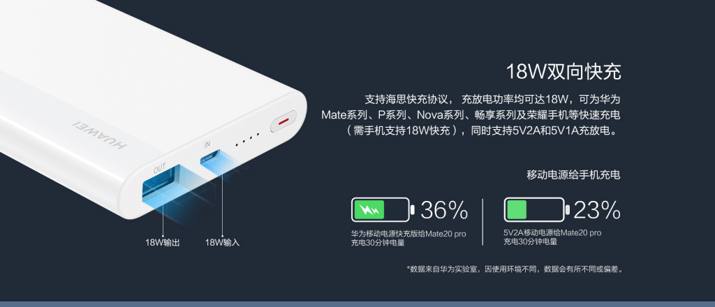 接口方面,USB-A對(duì)外輸出和Micro-USB輸入,均為18W快充,支持華為自家的FCP快充協(xié)議,可以給大多數(shù)華為、榮耀系列手機(jī)快充。其中移動(dòng)電源給華為Mate20 Pro充電,30分鐘可以充到36%。