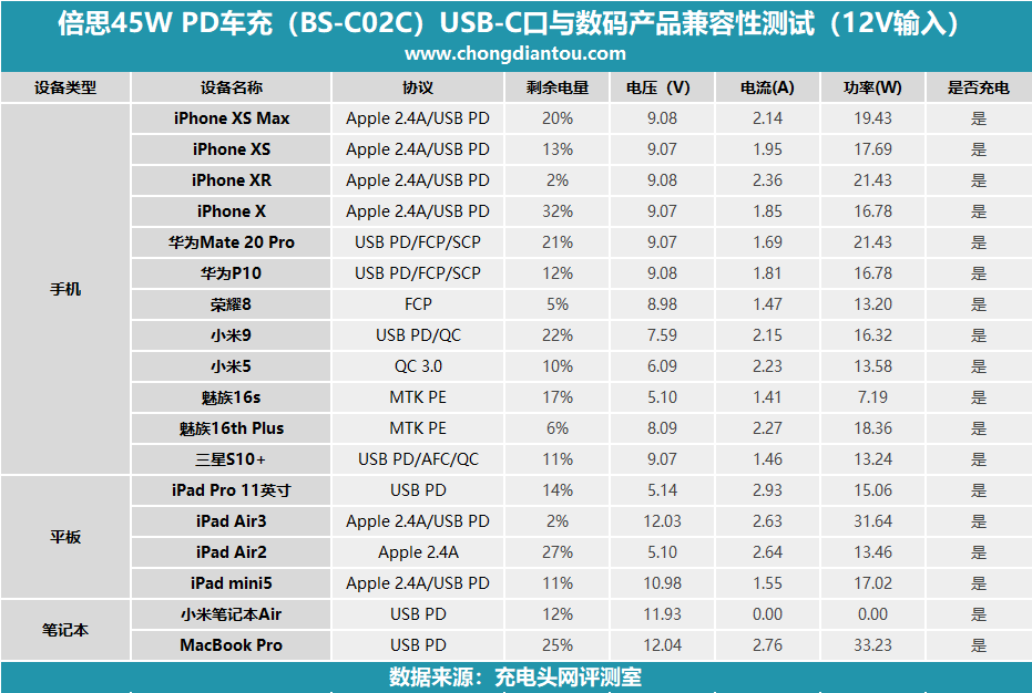 在13.8V電壓的輸入情況下,倍思45W PD車充兼容性還不錯,大部分設備都能握手開啟對應快充,它還可以為一些筆記本電腦充電,但是像小米筆記本Air這類挑電壓的筆記本電腦它就無能無力了,另外需要注意的是魅族16s兼容性欠佳,無法握手PE快充。