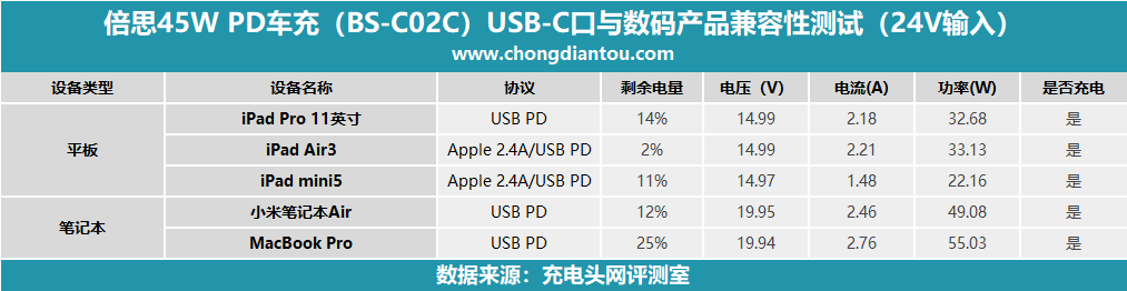 另外小編還測試了在24V輸入的情況下給大功率數碼產品充電的測試,如上圖所示,均能握手開啟高壓PD快充。