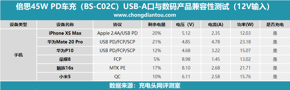倍思45W PD車充的USB-A口兼容性很不錯,所有測試設備均能握手開啟相對應快充與協議,包括上面測試USB-C口兼容性欠佳的魅族16s也可以為其開啟PE快充充電。另外,搭配華為5A數據線為Mate 20 Pro、P10手機充電,可以順利握手SCP快充,能給華為用戶帶來很不錯的充電體驗。
