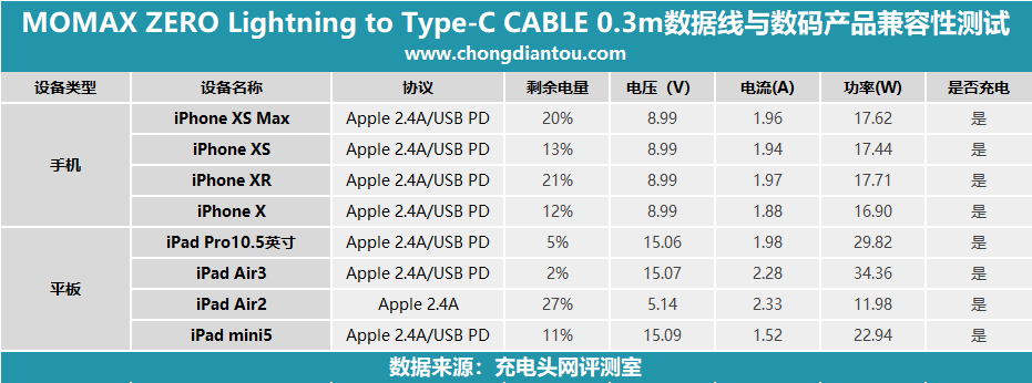 小編把測試數(shù)碼數(shù)碼產(chǎn)品兼容性的數(shù)據(jù)做了個表格,可以看到摩米士ZERO Lightning to Type-C CABLE 0.3m數(shù)據(jù)線均能給所測試支持PD快充的蘋果設(shè)備開啟快充,像iPad Air2不支持PD快充的設(shè)備它也能為它激活A(yù)pple 2.4A協(xié)議充電。