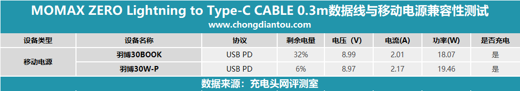 目前市面上帶Lightning輸入接口并且支持PD快充的移動電源較少,小編找來兩款羽博PD移動電源進行測試,摩米士ZERO Lightning to Type-C CABLE 0.3m數(shù)據(jù)線均能為它們激活開啟PD快充。